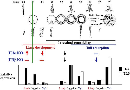 Figure 2. Distinct organ-specific effects of TRα- and TRβ-KO correlate with relative TR expression in the organs during development. Upper: Morphological changes of the whole animal, intestine, limb, and tail during metamorphosis. Middle: Knocking out TRα or TRβ has stage-dependent effects on metamorphosis of the limb, intestine, and tail. TRα KO accelerates (arrow pointing up) limb development prior to the onset of metamorphosis (stage 54, green line) but inhibits (arrow pointing down) it after the onset of metamorphosis, inhibits intestinal remodeling between stage 58 and stage 66, but has no effect (-) on tail resorption between stage 61 and stage 66. In contrast, TRβ KO does not affect limb development but inhibits intestinal remodeling and tail resorption (see (49) for more details). Note that these phenotypes are based on KO studies in Xenopus tropicalis, although similar results are expected for Xenopus laevis. Lower: relative expression of TRα and TRβ in the limb, intestine, and tail around stage 54 (left, premetamorphosis), stage 61 (a climax stage when intestinal remodeling is occurring dramatically), and stage 63 (a climax stage when tail resorption is occurring rapidly). Based on (56, 57). |