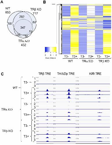 Figure 4. There are few TRα- or TRβ-specific TR-bound genes in intestine and TRα KO has bigger effect on target binding than TRβ KO in the intestine of premetamorphic tadpoles. (A) Venn diagram showing overlap among TR-bound genes identified in the wild type (WT), TRα KO, and TRβ KO intestine. The TR-bound genes in the presence or absence of T3 treatment for each genotype were combined together for the comparison. Note that 1) most genes bound by TR were common among all three genotypes, suggesting that TRα and TRβ bind to the same genes. There were more genes bound by TR in TRβ KO intestine compared to TRα KO intestine, suggesting that TRα KO has a bigger effect on TR-binding to targets than TRβ KO, presumably due to the higher level of TRα expression at stage 54. (B) Heatmap showing the CPM (count per million) value for all TR-bound genes identified in WT, TRα KO, and TRβ KO intestine with or without T3 treatment. CPM values were normalized across rows and clustered with Euclidean distance metric and average linkage. Blue to yellow gradient represents normalized level of TR binding (CPM) from low to high. Note that there are more genes with increased TR-binding (blue to yellow) after T3 treatment of WT and TRβ KO tadpoles compared to TRα KO tadpoles, indicating that TRα KO has a bigger effect on TR-binding to individual targets than TRβ KO. (C) TR binding to known TREs in the intestine of WT, TRα KO, and TRβ KO tadpoles at stage 54 increased after T3 treatment. IGV software was used to visualize known TRE regions of TR-target genes TRβ, TH/bZip, and Klf9, in the ChIP-seq data. Blue peaks in each wiggle plot represent the normalized ChIP-seq reads. There were three technical replicates for each sample (-T3 or +T3). The ChIP-seq were performed on intestines pooled from multiple premetamorphic tadpoles at stage 54 with or without T3 treatment. See (60) for more details. |