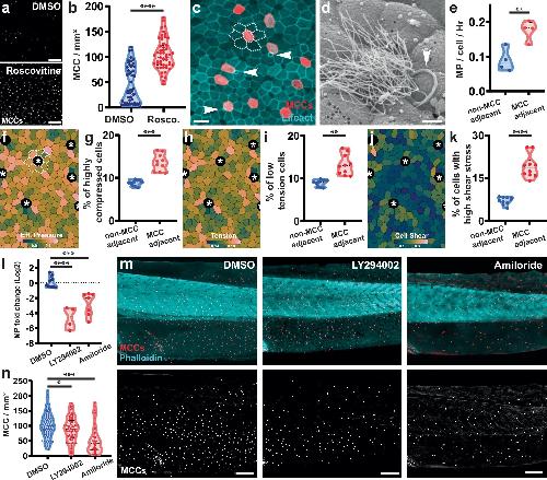 Fig. 4: Macropinocytosis regulates tissue crowding during epithelial development. a Representative images of multiciliated cells (MCCs, marked with acetylated tubulin ab) in ST47 embryo after treatment with DMSO or Roscovitine. Scale bar 300 μm. b Quantification of MCC number in embryo treated for 24 h with either DMSO or Roscovitine (n = 4 exp. and 50 DMSO and 51 Roscovitine embryos; two-sided unpaired t-test, p-value = 1.42e-014). c Representative image of macropinocytic events (arrowheads) occurring next to MCCs in the epithelium of a TubA1A-membrane RFP transgenic embryo labeling multiciliated cells (red) and injected with Lifeact-FP (cyan). Dashed lines represent rosette-like structure around MCCs. Scale bar 30 μm. d Representative SEM image showing a macropinocytotic event (arrowhead) adjacent to an MCC. Scale bar 5 μm. e Quantification of the number of events (MP) per cell per hour for cells adjacent or not adjacent to MCCs (n = 4 exp. 191 macropinocytotic events; two-sided paired t-test, p-value = 0.0034). f, h, j Images of a simulated epithelium with multiciliated cells (asterisk). Cells are color-coded for effective pressure (f), tension (h) or shear stress (j). Dashed lines represent rosette-like structure around MCCs. g, i, k Percentage of non-MCC neighbors and MCC neighbors that are in the highest decile of effective pressure (g) and shear stress (k) or in the lowest decile of tension (i) (n = 10 simulations; two-sided paired t-test; effective pressure p-value = 0.0004, tension p-value = 0.0021, shear stress p-value = 5.4e-05). l Quantification of the fold difference in macropinocytotic events comparing 1 h before and 1 h after treatment with DMSO (n = 9 exp.), 5 μM LY294002 (n = 4 exp.; p-value = 8.0e-06), or 1 mM Amiloride (n = 7 exp.; p-value = 0.0002); two-sided unpaired t-tests. m Representative images of MCCs (marked with acetylated tubulin ab; red/white) in ST46 embryos stained with phalloidin (cyan) after treatment with DMSO, LY294002 or Amiloride. Scale bar 300 μm. n Quantification of the number of MCCs after treatment with DMSO (n = 115 embryos), 5 μM LY294002 (n = 81 embryos; p-value = 0.0457) or 1 mM Amiloride (n = 49 embryos; p-value < 0.0001); two-sided unpaired t-tests. Source data are provided as a Source Data file.