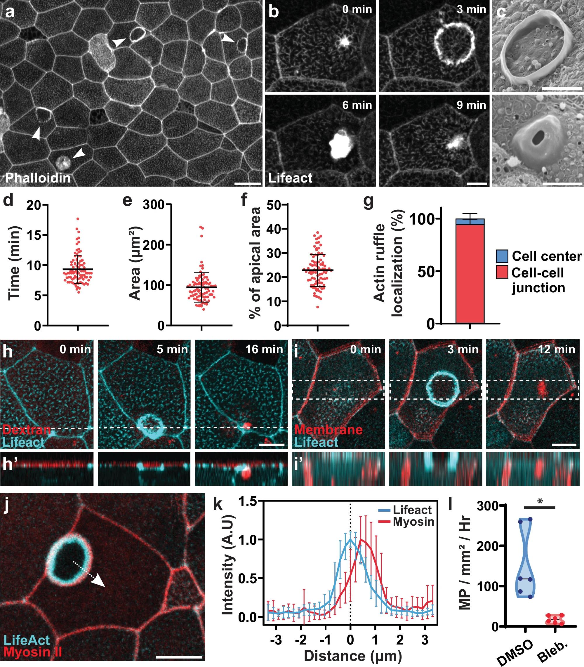 Fig. 1: Constitutive macropinocytosis occurs in the apical surface of the Xenopus embryonic epidermis. a Actin ruffles (arrowheads) in the epidermis of Xenopus embryo stained with phalloidin. Scale bar 20 μm. b Timelapse of a single ruffle event in the epidermis of Xenopus embryo expressing Lifeact-fluorescent protein (FP). Scale bar 10 μm. c SEM images of actin ruffles as circular (top) or dome-shaped (bottom). Scale bar 5 μm. d–f Quantification of actin ruffle duration (d), peak area (e), and percentage of apical area (f) (n = 3 exp. and 90 ruffles; center line = mean; error bars = SD). g Quantification of actin ruffle localization within the cell (n = 9 exp. and 361 ruffles; bar = mean; error bars = SD). h Time lapse image of the Lifeact-FP (cyan) showing macropinocytotic internalization of fluorescent dextran (red) from the media, h’ is a z projection of the dotted line. Scale bar 10 μm. i Time lapse image of the Lifeact-FP (cyan) showing internalization of apical membrane (red) during macropinocytosis, i’ is a z projection of the dotted area. Scale bar 10 μm. j Circular actin ruffle (cyan, Lifeact-FP) surrounded by an outer ring of activated myosin II (red; SF9 intrabody). The dotted arrow shows an example of linescan averaged in (k). Scale bar 10 μm. k Localization of Lifeact and activated myosin II at the peak of an actin ruffles (n = 2 exp. and 15 ruffles; point = mean; error bars = SD). l Quantification of macropinocytosis (MP) events in embryos treated with DMSO or Blebbistatin (n = 3 exp. and 6 embryos; two-sided paired t-test, p-value: 0.0116). Source data are provided as a Source Data file.