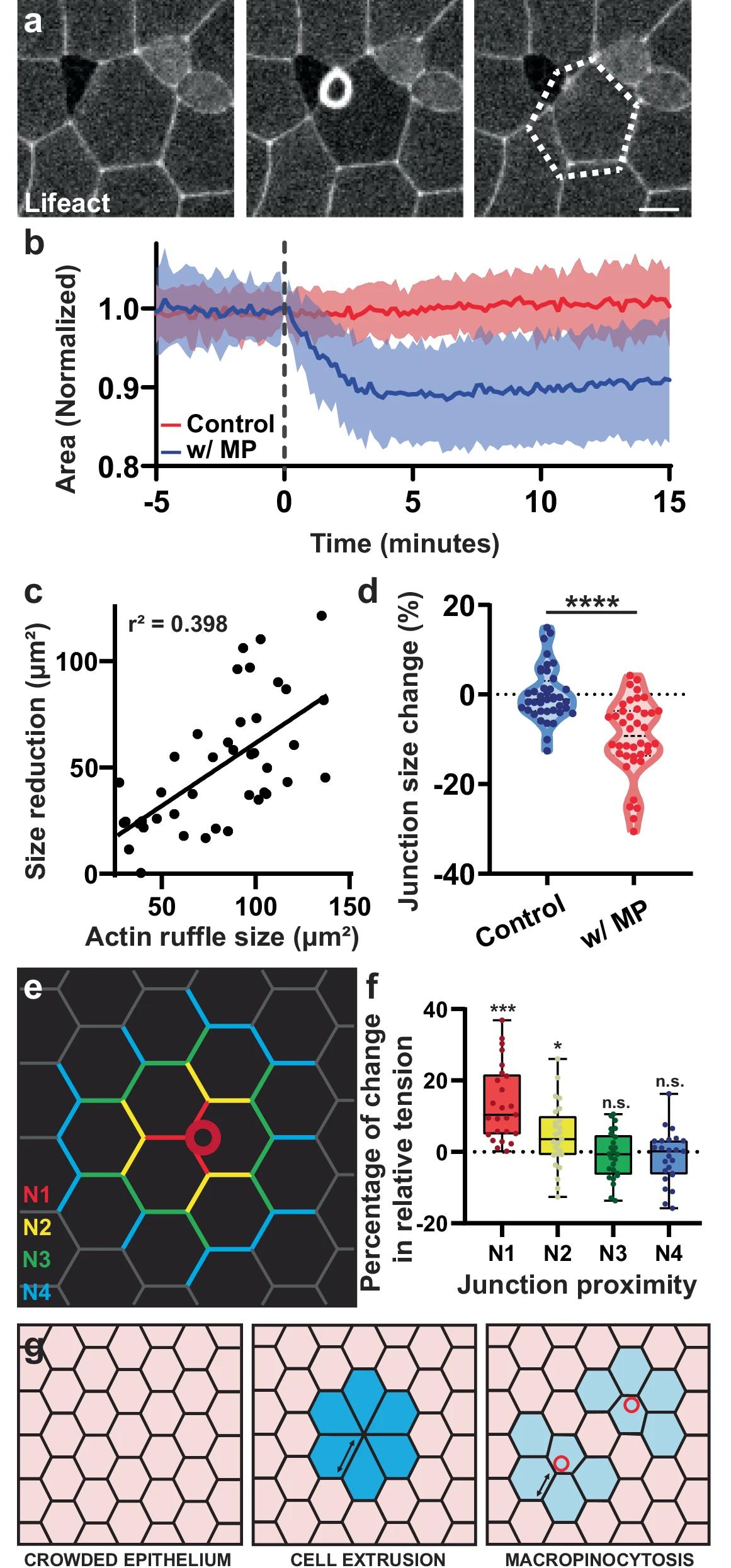 Fig. 3: Macropinocytosis leads to cell size reduction. a Time lapse of a macropinocytotic event in tissue labeled with Lifeact-FP. The dotted line represents cell original size, highlighting the cell size reduction. Scale bar 10 μm. b Quantification of cell size change in cells with (blue) or without (red) a macropinocytotic event (MP) using cells synchronized to the onset of macropinocytosis and normalized to original cell size (n = 3 exp. and 43 cells total; mean and SD). c Correlation between the apical size reduction and the size of actin ruffle (n = 3 exp. and 43 cells). d Quantification of the change in junction length in cells with and without macropinocytosis (n = 4 exp. and 40 cells; two-sided unpaired t-test, p-value = 1.23e-07). e Graphical depiction of a cell with different junction types labeled (N1-N4) in different colors based on their distance from the macropinocytotic event. f CellFit analysis of time lapse movies quantifying the change in relative junctional tension before and after macropinocytosis (n = 25 events; see Fig. S1f; box = interquartile, center line = median, error bars = min/max; two-sided paired t-test of before and after the event p-value N1 = 0.0001, N2 = 0.0281, N3 = 0.4890, N4 = 0.3492). g Model comparing the effect of cell extrusion (center) or macropinocytosis (right) occurring in the cell (asterisk) of a crowded epithelium (left). Blue color highlights the putative effect on cells/neighbors. Source data are provided as a Source Data file.