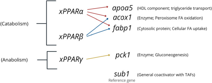 Figure 1. Summary of xPPARα/β/γ target genes selected for RT‐qPCR analysis and the function of the encoded protein. HDL = High Density Lipoprotein, FA = Fatty Acid, TAFs = Transcription factors.