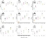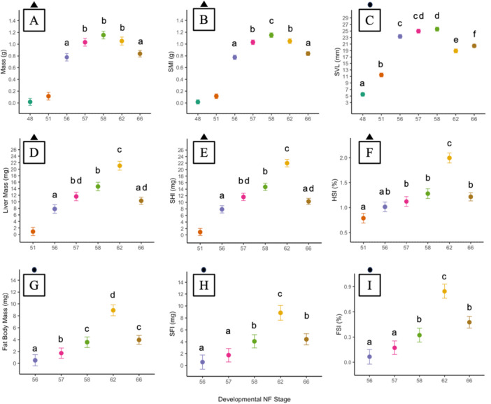 Figure 2. Marginal mean ± 95% CI of mass (A), Scaled Mass Index (B), Snout‐Vent‐Length (C), liver mass (D), Scaled Liver Index, SLI (E), Hepatic Somatic Index, HSI (F), fat body mass (G), Scaled Fat Body Index, SFI (H), and Fat Body somatic Index, FSI (I) of X. laevis across NF Stages for the characterization study. Colors represent NF Stages. Triangles denote for which plots compact letter display represents Tukey post‐hoc test at 5% threshold of significance. No letter indicates NF Stage was excluded from parametric analysis due to severe heteroskedasticity. Circles denote for which plots compact letter display represents Games‐Howells post‐hoc test at 5% threshold of significance. Marginal means not sharing any letters are statistically different. n = 12–19 per NF Stage.