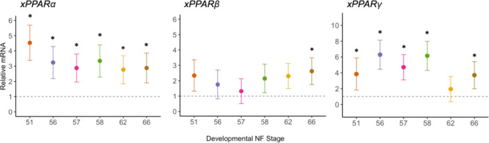 Figure 3. Marginal mean ± 95% CI of liver xPPARα, xPPARβ, and xPPARγ relative mRNA (i.e., fold change) for X. laevis (NF 51‐66) relative to whole animal NF 48 expression represented by a dash line at 1. Dots represent treatment marginal mean ± 95% C.I. Asterisks (*) indicate the marginal mean was significantly different from NF 48 (p < 0.05) from a Dunnett post‐hoc test. n = 5–8 per NF stage.