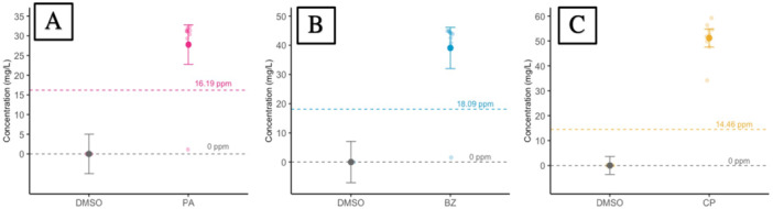 Figure 4. Marginal mean ± 95% CI of concentrations of pirinixic acid PA (A), bezafibrate BZ (B), and ciprofibrate CP (C) using LC/MS/MS. Panels A–C represent concentrations in exposure solution from pooled water samples collected at the initiation of each temporal block (n = 9) taken immediately after addition of the tadpole. Dashed line represents nominal concentration for exposure solution (A–C).
