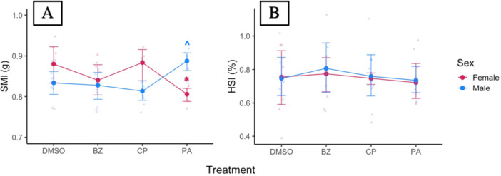 Figure 6. Interaction plot between genotypic sex and treatment means ± 95% CI for Scaled Mass Index, SMI (A) or Hepatic Somatic Index, HSI (B) for X. laevis exposed to either a DMSO vehicle control or an agonist (bezafibrate [BZ], ciprofibrate [CP], pirinixic acid [PA]) with raw data displayed in the background. Dots represent treatment mean ± 95% CI “*” indicates a significant (p < 0.05) and “^” indicates a weak (p < 0.1) treatment effect from a Dunnett post‐hoc test. n = 12 per treatment (nfemale = 4–6/treatment, nmale = 6–8/treatment).