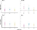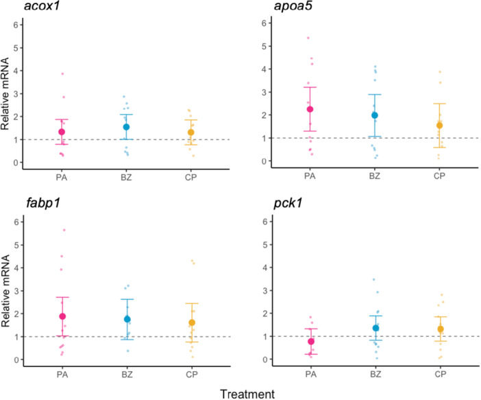Figure 7. Marginal mean ± 95% CI of xPPAR target genes (acox1, apoa5, fabp1, pck1) expression in livers of X. laevis exposed to a xPPAR agonist (pirinixic acid, PA; bezafibrate, BZ; ciprofibrate, CP). Values relative to DMSO vehicle controls represented by the dashed line at 1.0. Raw data displayed in the background. n = 11–12 per treatment.