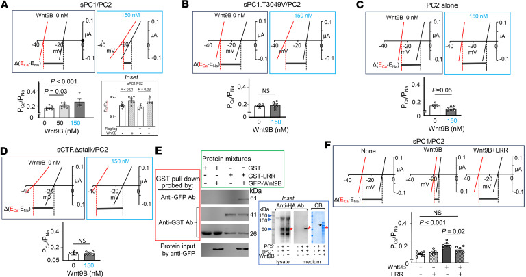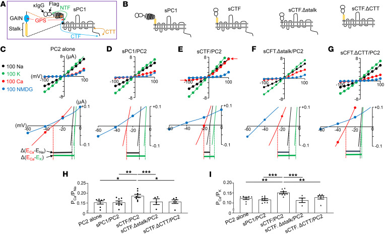 Mutations on genes encoding polycystin-1 (PC1) and PC2 cause autosomal-dominant polycystic kidney disease. How these 2 proteins work together to exert anticystogenesis remains elusive. PC1 resembles adhesion G-protein coupled receptors and undergoes autocleavage in the extracellular N-terminus to expose a hidden "stalk" region, which is hypothesized to act as a "tethered agonist." Here, we show that WT PC1 and PC2 formed functional heteromeric channel complexes in Xenopus oocytes with different biophysical properties from PC2 homomeric channels. Deletion of PC1 N-terminus, which exposed the stalk, increased calcium permeability in PC1/PC2 heteromers that required the presence of stalk. Extracellular application of synthetic stalk peptide increased calcium permeation in stalkless PC1/PC2. Application of Wnt9B protein increased calcium permeability in PC1/PC2 but not in heteromers containing cleavage-resistant mutant PC1. Wnt9B interacted with N-terminal leucine-rich repeat (LRR) of PC1. Pretreatment with LRR blunted the increase in calcium permeability by Wnt9B. Thus, PC1 and PC2 form receptor-channel complexes that is activated by exposure of the stalk region following ligand binding to the PC1 N-terminus. The stalk peptide acts as a tethered agonist to activate PC1/PC2 by affecting ion selectivity of the complexes.