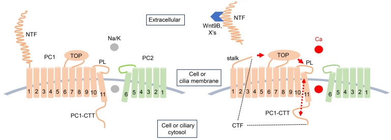 Cleavage of N-terminus of polycystin-1 increases calcium permeability of polycystin-1/2 receptor channel complexes.