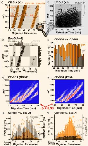 Figure 2. Advancing deeper proteomics through Real‐Time Electrophoresis‐Correlative (Eco) data acquisition with AI‐aided data processing on a legacy Orbitrap mass spectrometer. A 10 ng HeLa digest was analyzed by CE– and nanoLC–MS. a) Eco sorting grouped the peptide ions into temporally correlated data clusters based on mass‐to‐charge (m/z) and separation time (2+ charge shown, Pearson ρ ≥ 0.93), whereas b) nanoLC spread them broadly over the dimensions (ρ = 0.29). c) Eco‐data independent acquisition (DIA), using 5 segmented m/z–migration time windows, identified ∼38% more proteins than the control while using <50% of the analytical bandwidth. d) Data‐dependent acquisition (DDA) with standard isolation width (1.6 Th) tracked the m/z–migration correlation with up to 99% success. e), f) MS/MS events aligned with the density of the identified peptide spectral matches (PSMs), reflecting high real‐time sequencing efficiency (ρ = 0.93). g), h) AI‐assisted data processing software (CHIMERYS, Thermo) improved deconvolution of highly chimeric spectra, identifying over 3× more molecular features (MFs). Together, these results demonstrate that Real‐Time Eco–AI enables deep proteome coverage even on earlier‐generation Orbitrap instruments.