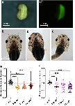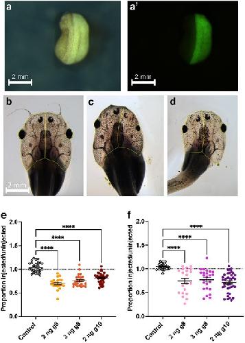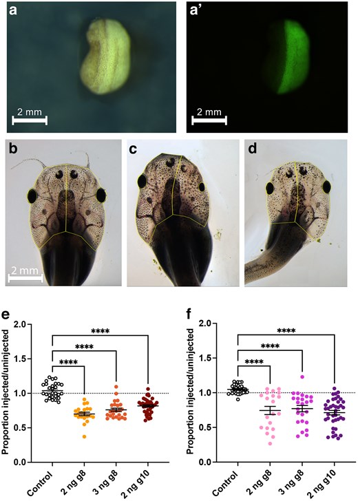 Fig. 2.Unilateral knockdown of recql4 results in smaller head and eye size on the edited side. a) Example of bright field and a′) fluorescence view of neurula embryo, dorsal view, and anterior uppermost. The embryo was injected on the right side at the 2-cell stage, and GFP can be seen only on the right side of the midline. b to d) Examples of tadpoles at 3 wk; outlines show the regions of interest (ROIs) used to measure area of the head and eye on the left and right sides using Fiji. Scale bar in b) applies to all panels. b) Control, injected with GFP mRNA only on the left side. c) Tadpole from the group injected with 2-ng recql4 sgRNA 8 (g8) and nGFP mRNA on the right and d) on the left. e and f) Scatter plots showing the proportions injected vs uninjected head side e) or eye f) area. Line indicates mean ± SEM. Dotted line denotes no difference between the 2 sides. Recql4-injected groups are compared to the control (only injected with GFP mRNA) using Kruskal–Wallis tests with Dunn's post hoc comparisons. Sample sizes are GFP-only controls: N = 28, 2-ng g8; N = 21, 3-ng g8; N = 24, 2-ng g10; and N = 39. Significantly different groups are indicated as ****P < 0.0001. Raw data can be found in Supplementary Tables 1 to 6 in Supplementary File 1. |