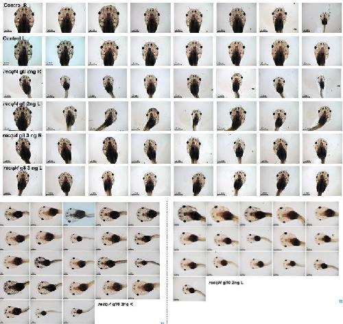 Supplementary Figure 1: Examples of recql4 CRISPR half tadpoles at 3 weeks of development (Figure 2E,F) Top: first tadpole batch, controls are injected with just GFP mRNA, CRISPants using sgRNA8, scale bars 2 mm. Dorsal view of head and trunk with anterior uppermost. Bottom second tadpole batch using sgRNA10, dorsal view of head and trunk with head to left, scale bars 1 mm. L, injected on Left side, R, injected on right side. |