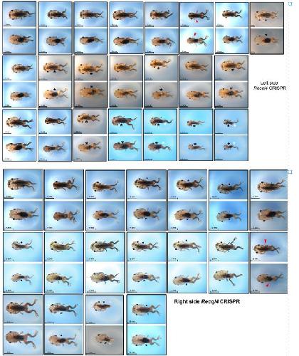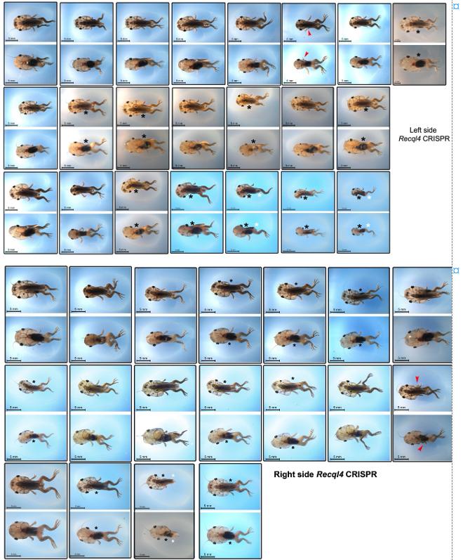 Supplementary Figure 2 Stage 58 half CRISPR recql4 sgRNA8 tadpoles (Figures 3, 4). Dorsal and ventral views for each animal are boxed, tails have been removed. Top, Left side CRISPants, Bottom, right side CRISPants, red arrowheads indicate ectopic limbs, black asterisk indicates a missing forelimb, white asterisk indicates a missing hindlimb. Scale bars 5 mm. |