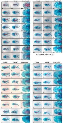 Supplementary Figure 3: Cartilage (blue) and bone (red) staining of half recql4 CRISPants (Figures 3, 4). Individual tadpoles are boxed, dorsal (left) and ventral (centre) showing whole stage 58 tadpole, right image is a zoom of the head cartilages from the ventral side. Top: left CRISPants, Bottom: right CRISPants. |