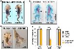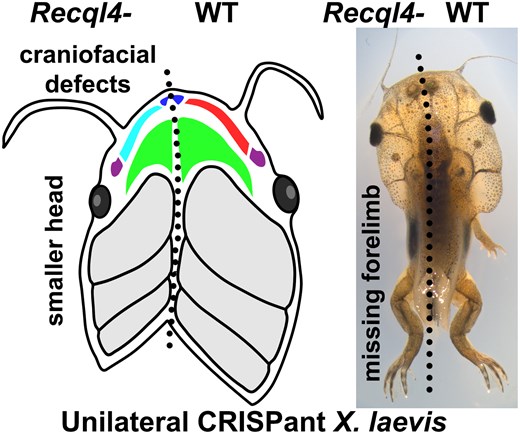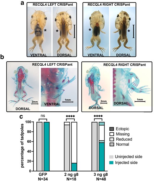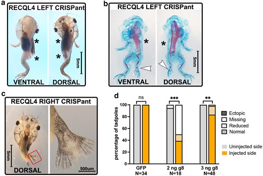 Fig. 4.Hindlimbs are more resistant to loss of Recql4 than forelimbs. a) Example of NF 58 stage tadpole where CRISPR knockdown of recql4 on the left side has led to failure of the left hindlimb to develop as well as the forelimbs. Missing limbs are indicated by an asterisk. b) Skeletal preparation of NF58 tadpole showing example of a smaller hindlimb on the recql4-edited left side (white arrowhead). Bone and cartilage staining show that this limb is not missing any elements. This individual is also missing the left forelimb as indicated with an asterisk. c) A single example of an ectopic hindlimb found in the study is shown. This tadpole is stage NF55 and editing is on the right. Two limbs appear as a mirror image duplication (preaxial polydactyly) on the right side and a single limb (partially obscured by the tail) on the left. Both forelimbs are present but cannot be seen due to the prehatching stage. d) Stacked bar graph showing observed frequency of hindlimb phenotypes on the injected vs uninjected side of half-CRISPant tadpoles. Fisher's exact tests, ns = nonsignificant, *** = P < 0.001, **P < 0.01. Count data is in Supplementary Table 7 in Supplementary File 1. |
