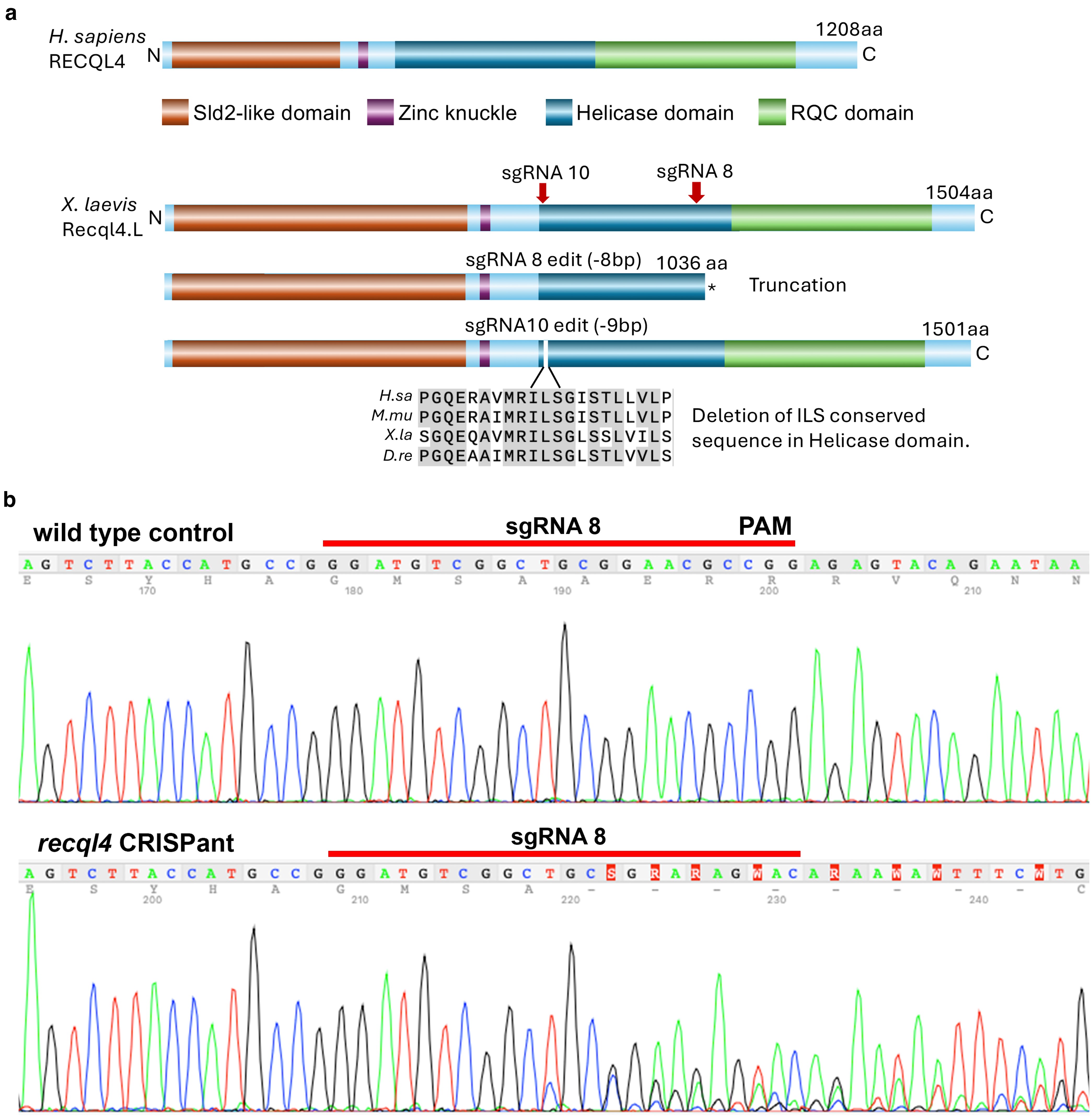 Fig. 1.Schematic of Homo sapiens (H. sapiens) and X. laevis RECQL4 proteins and CRISPR sgRNAs. a) Protein domain structure for human RECQL4 and X. laevis Recql4; down arrows indicate sgRNA target positions. Asterisk indicates premature stop codon. sgRNA 8 generates predominantly 8-bp deletions that will introduce a downstream stop codon in the helicase domain, resulting in a truncated protein. sgRNA 10 generates a dominant 9-bp deletion that removes bases “I,L and S” in a conserved region of the helicase. Protein alignments are shown for human, mouse, Xenopus, and zebrafish with shading highlighting conserved residues. b) Example of sgRNA8 editing, Sanger sequence traces from control wild type, and sgRNA8 CRISPant. Guide sequence is indicated by line on top of the Sanger trace. |