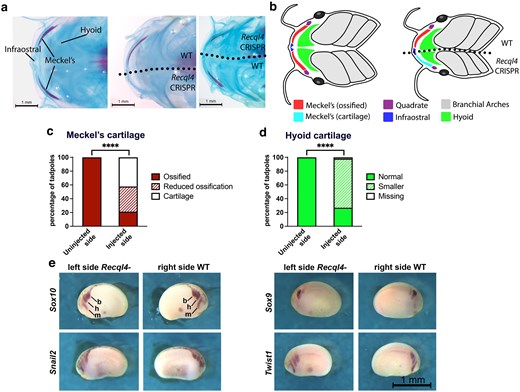 Fig. 5.Recql4 unilateral CRISPants have craniofacial defects on the edited side, but this does not arise from altered migration of cranial neural crest cells. a) Tadpole stage NF58 skeletal preparations, showing a ventral view of the jaw with the cartilage stained blue and the ossified bone stained red. The left image shows a control tadpole, the center shows a tadpole where recql4 was knocked down on the left side (no ossification of Meckel's cartilage on the injected side), and the right shows a tadpole with recql4 knockdown on the right side (reduced ossification of Meckel's on the injected side. b) Diagram of control and left-sided CRISPant tadpole ventral craniofacial structures to show the positions of the cartilages. c) Stacked bar graph comparing the frequency of the reduced or absent ossification of Meckel's cartilage on the uninjected vs injected side of unilateral recql4 CRISPants. N = 52, Fisher's exact test, ****P < 0.0001. d) Stacked bar graph comparing the frequency of smaller-sized hyoid cartilage on the uninjected vs injected unilateral CRISPants. N = 52, Fisher's exact test, ****P < 0.0001. e) In situ hybridization of early cranial neural crest markers in stage 19 unilateral recql4 CRISPants (left side edited). The cranial neural crest cells migrate from the dorsal neural tube in 3 streams, the mandibular (m), hyoid (h), and branchial (b). The scale bar in the bottom right panel relates to all panels. Further examples can be found in Supplementary Fig. 3. |