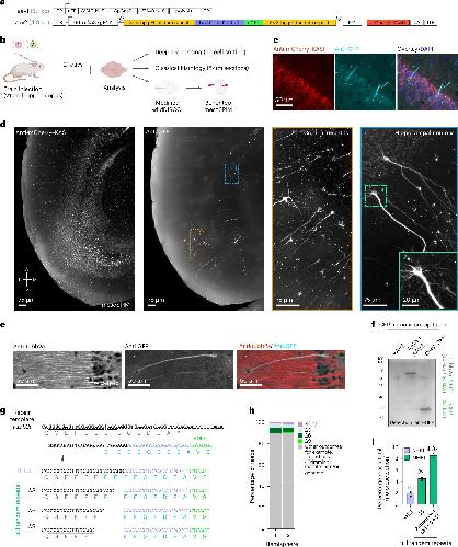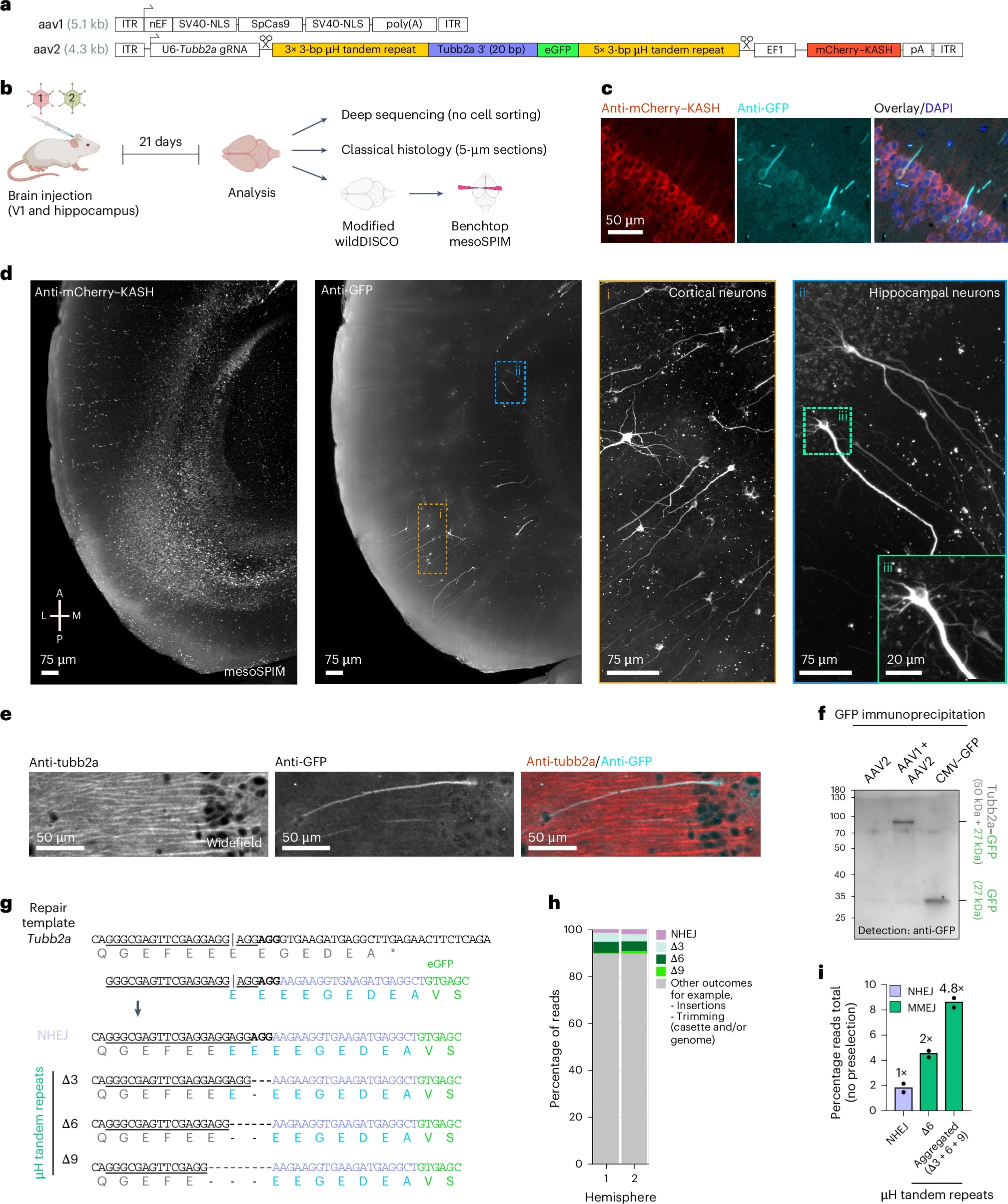 Fig. 5: Endogenous fluorescence tagging of Tubb2a in vivo in adult mouse brains by µH tandem repeat-mediated integration. a, Schematic of AAV constructs for targeted eGFP knock-in at the 3′ CDS of Tubb2a. b, Schematic of the experimental setup and subsequent analysis. c, Histology of brain tissue and immunofluorescence detects eGFP-tagged Tubb2a in individual neurons. d, Benchtop mesoSPIM light-sheet imaging of wildDisco-cleared whole mouse brain shows eGFP-tagged Tubb2a in cortical and hippocampal neurons. e, Representative widefield immunofluorescence images showing GFP and Tubb2a expression in neurons. f, Western blot analysis comparing GFP immunoprecipitation from brains infected with either AAV2 alone, codelivered AAV1 and AAV2 or a control virus constitutively expressing GFP under the control of a CMV promoter. g, Sequence of the targeted Tubb2a locus (gRNA underlined, PAM in bold), the repair template and possible NHEJ and µH tandem repeat-mediated editing outcomes. h, Summary of integration outcomes using NGS reads spanning Tubb2a–eGFP amplified from two mouse hemispheres. i, Frequency of in-frame reads of Tubb2a–eGFP detecting either NHEJ or µH tandem repeat-mediated integration outcomes as defined in g. Each data point represents a single, independently injected brain hemisphere zone from the same mouse. Some schematics were created with BioRender.com.
