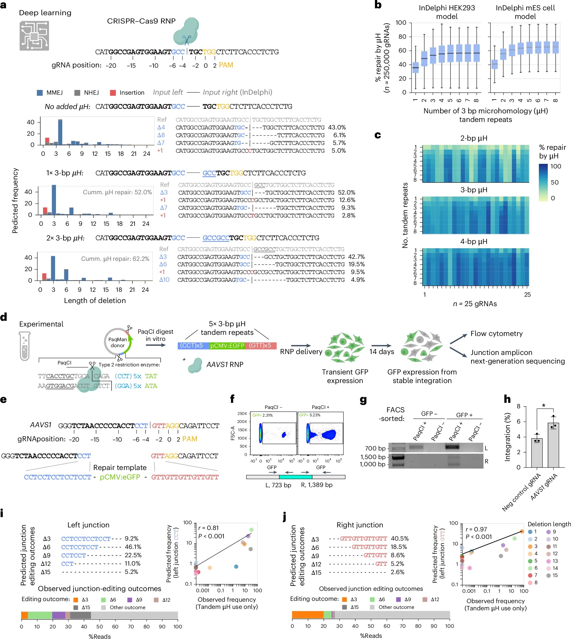 Fig. 1: Modeling predicted gene-editing outcomes using inDelphi while providing synthetic µHs. a, Predicted editing outcomes are shown using inDelphi (HEK293T) on synthetic DNA. Adding tandem repeats of the bases left of the CRISPR–Cas cut site to the right of the cut affected the predicted editing outcomes. Cumulative µH repair is defined as the percentage of editing outcomes that mobilize (delete) synthetic µHs during repair. Iterative recutting of products is not computationally modeled. b, Modeling of expected editing outcomes across 250,000 distinct gRNAs target sites across human Chr1, when adding the 3 bp flanking the left site of the CRISPR–Cas cut site either as a single repeat (1×) or as tandem repeats (2×–8×). The percentage of repair by µH usage is shown. Box plots show the median, interquartile range (IQR) and whiskers extending to 1.5× the IQR with n = 250,000. c, Heat map highlighting the expected percentage of repair by µH as a function of the length of µH and the number of tandem repeats for 25 gRNAs, demonstrating that there is a sequence-context-specific optimal solution for maximizing the percentage of µH repair outcomes. d, Schematic of the experimental setup: PaqCI digestion releases the linear dsDNA donor, which contains 5× 3-bp µH tandem repeat arms, and is codelivered with RNP targeting AAVS1. e, Sequence of the target locus and 3-bp µH tandem repeat repair arms. f, After 14 days, flow cytometry indicates an increase in stable integration in cells transfected with the linear dsDNA template. g, Integration occurs specifically with PaqCI-linearized templates; circular templates show no detectable on-target integration. h, Quantification of integration efficiency of AAVS1 gRNA compared to a negative control gRNA. Statistical analysis was performed using an unpaired two-tailed t-test; P = 0.021 (n = 3 independent biological replicates). Error bars represent the s.d. i,j, The InDelphi HEK293T model accurately predicts the observed frequency of distinct editing outcomes in the µH tandem repeat arms at both junctions. Data points are the means of three independent biological replicates. A two-sided Pearson correlation was applied (i, r = 0.815, P = 0.00022; j, r = 0.969, P = 1.10 × 10−8). No multiple comparisons were performed. Some schematics were created with BioRender.com. |