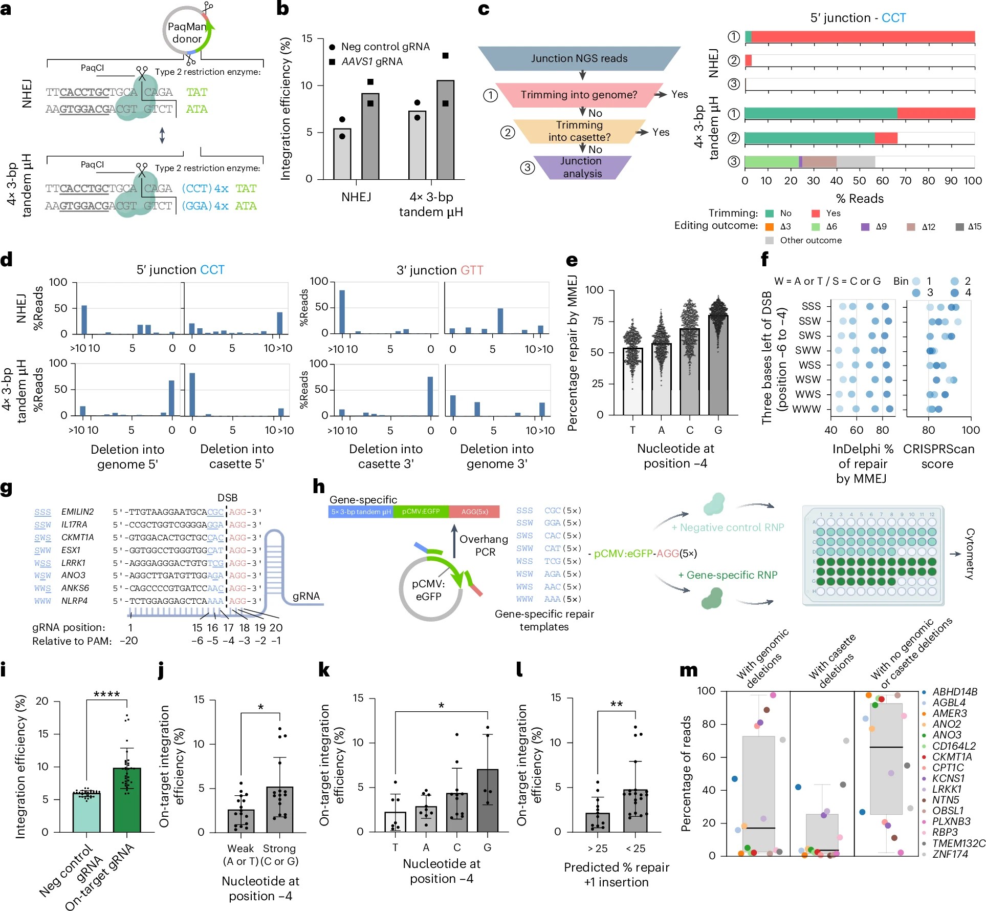 Fig. 2: µH tandem repeat repair arms protect the genome and the relationship between integration efficiencies and local sequence context. a, Schematic representation of the experimental setup comparing NHEJ integration (no repair arms) to 4× 3-bp µH tandem repeat repair arms using PaqMan plasmids. b, Comparison of µH tandem repeat-mediated and NHEJ integration efficiencies (n = 2 independent biological repeats). c, Visualization of genome-editing outcomes on both genome–transgene junctions showing the percentage of reads that trimmed the genome (1), the percentage of reads that trimmed the cassette (2) and specific editing outcomes of reads that trimmed neither the genome nor the cassette (3). d, Quantification of genome-editing outcomes on both genome–transgene junctions demonstrating that NHEJ leads to extensive trimming, while 4× 3-bp µH tandem repeat arms protect both the genome and the transgene cassette. e, In the absence of exogenous DNA, in silico modeling predicts that the nucleotide at position −4 will influence the percentage of repair outcomes that is expected to be driven by MMEJ (total n = 10,813,171; plotted random subselection of 500,000 data points). f,g, The 32 gRNAs designed to target coding exons of nonessential genes with four in each of eight classes covering all possible permutations of strong (G or C) and weak (A or T) bases at 3 bp left of the DSB. Each class was composed of four gRNAs binned across the inDelphi-predicted percentage of repair by MMEJ and had similar expected on-target efficiencies (CRISPRScan scores). h, For each gRNA, a distinct dsDNA repair template was generated with 5× 3-bp µH tandem repeat repair arms matching the gRNA-specific context left of the DSB and 5× 3-bp µH tandem repeat repair arms matching the AGG right of the DSB. These were delivered with nontargeting control RNP (top) or gene-targeting RNP (bottom) to HEK293T cells. Each data point represents an independent biological replicate. i, Integration efficiencies at day 14, determined by flow cytometric quantification of GFP⁺ cells. Statistical analysis was performed using a Mann–Whitney test (two-tailed, exact, P = 6.23 × 10⁻⁷, n = 32). j, Quantification of on-target integration efficiencies comparing the presence of a strong or weak base at position −4, just left of the DSB. Statistical analysis was performed using a Mann–Whitney test (two-tailed, exact, P = 0.0211, n = 16. k, On-target integration efficiencies by base identity at position −4, with guanine showing the highest. Each point represents the mean of three biological replicates. Sample sizes: T, n = 7; A, n = 9; C, n = 11; G, n = 5. Statistical analysis was performed using a Kruskal–Wallis test (P = 0.0445) with Dunn’s post hoc test (two-sided, corrected for six comparisons); T versus G, adjusted P = 0.0397. l, inDelphi modeling of the junction product between the sequence left of the DSB and the dsDNA donor. A higher percentage of predicted editing outcomes that have a +1 insertion will result in a lower on-target integration efficiency. Samples were grouped on the basis of the predicted percentage repair with +1 insertion (>25% and <25%). Statistical analysis was performed using a Mann–Whitney test (two-tailed, exact, P = 0.0092, U = 54, n₁ = 12, n₂ = 20). In i–l, error flags represent the s.d.; the center is the mean and each data point represents the mean of three independent biological replicates. m, NGS of left (5′) junction product and the percentage of reads containing genomic deletions or cassette deletions or neither genomic nor cassette deletions (n = 16 genes, each analyzed by sequencing after equimolar pooling of DNA from three independent biological replicates). Box plots show the median, IQR (box) and whiskers extending to 1.5× the IQR. Some schematics were created with BioRender.com. |