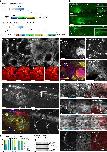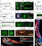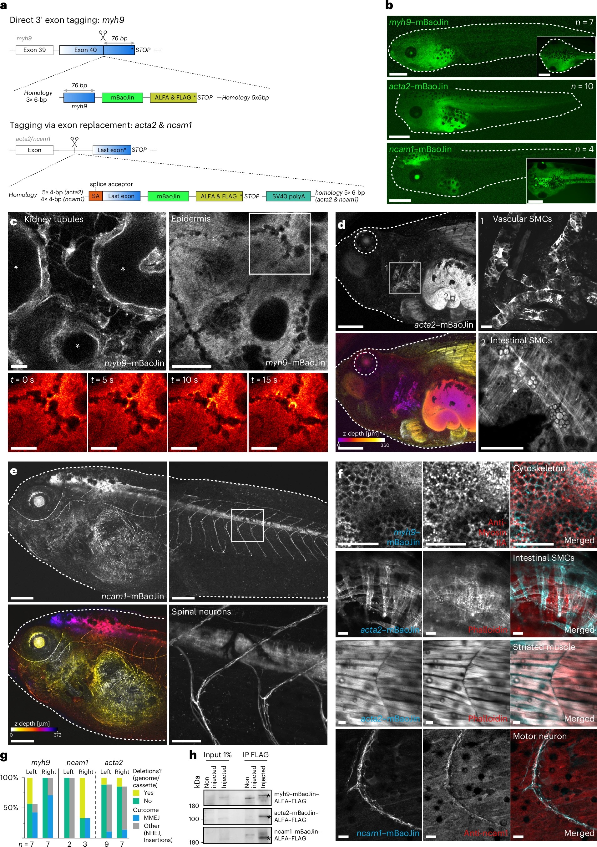 Fig. 4: Endogenous fluorescent protein tagging in X. tropicalis. a, Schematic representation of the repair templates for endogenous gene tagging. Coding sequences linked with GSG linkers. b, Unilateral (Myh9 and Acta2) and bilateral (Ncam1) mBaoJin expression in F0 animals because of endogenous gene tagging. Scale bars, 500 μm. c, Imaging of tagged Myh9 in a living stage 45 tadpole. Top left, kidney tubules with a luminal Myh9 layer (*tubular lumen) and Myh9 signal in intertubular fibroblasts. Top right, epidermal cells showcasing the role of Myh9 in cell–cell adhesions. Bottom right, live imaging of actomyosin dynamics within cell–cell boundaries. Scale bars, 10 μm (top) and 5 μm (bottom). d, Imaging of tagged Acta2 in a living stage 45 tadpole. Left, overview showing fluorescence signal in intestinal smooth muscle cells (SMCs), vascular SMCs, heart muscle and skeletal muscle. Line-scanning artifacts in heart muscle because of heartbeat during acquisition. Gamma correction of 0.2 because of strong signal from intestinal SMCs. Top right, vascular SMCs wrapping around developing blood vessels. Bottom right, actomyosin network of the two perpendicular layers of intestinal SMCs. Scale bars, 250 μm (left) and 25 μm (right). e, Imaging of tagged Ncam1 in a living stage 45 tadpole. Expression of Ncam1 in the central and peripheral nervous system. Bottom right, spinal cord with branching motor and sensory neurons. Scale bars, 200 μm (top and bottom left) and 50 μm (bottom right). f, mBaoJin signal (cyan), immunofluorescence staining (red) and overlay in stage 45 fixed tadpoles. Top, intracellular Myh9 network in the epidermis. Middle top, intestinal SMCs in a unilaterally transgenic tadpole. Bilateral origin of SMCs leading to mosaic expression of labeled Acta2. Middle bottom, Striated skeletal muscle. Bottom, tail motor neuron. Scale bars, 10 μm. g, Repair outcomes of genome–cassette boundaries. h, Western blots detecting tagged endogenous protein. |