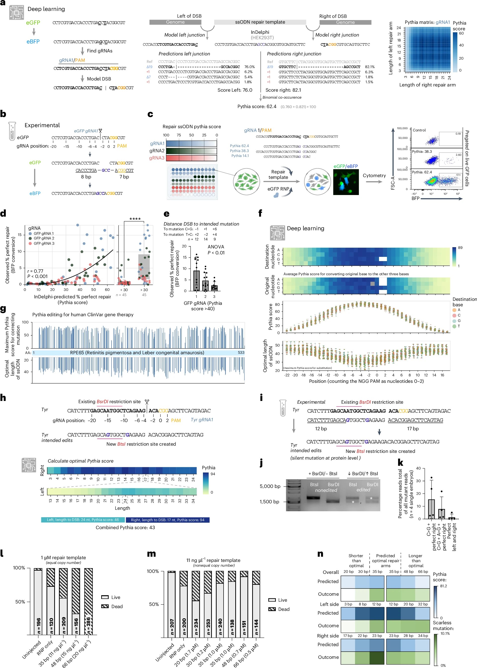 Fig. 6: Pythia editing, leveraging predictability to create small point mutations in vitro and in vivo in X. tropicalis. a, eGFP-to-eBFP conversion can be achieved by establishing two point mutations. Schematic representation of Pythia, a bioinformatics pipeline, deploying the inDelphi model to calculate expected editing outcomes on both junctions, which yields a combined Pythia score defined as the binomial co-occurrence of the intended edit. Right, the Pythia scores for different repair arm lengths is depicted as a Pythia matrix. b, Strategy for converting eGFP into eBFP using an 18-bp-long ssODN designed by Pythia (homologous sequences underlined). c, Experimental setup for determining eGFP-to-eBFP conversion efficiencies using three different gRNAs, with 30 distinct ssODN repair templates binned across deciles of Pythia scores. d, Scatter plot showing a direct correlation between Pythia scores and fluorescence conversion, across all three tested gRNAs (Spearman’s two-tailed, exact, P = 3.66 × 10−15, ρ = 0.774, n = 90). Comparison of conversion rates between ssODN repair templates with a predicted Pythia score of below and above 30. Samples were grouped on the basis of the predicted percentage repair: <30%, n = 45; >30%, n = 45. Statistical analysis was conducted using a Mann–Whitney test (two-tailed, exact, P = 3.20 × 10−12, U = 148.5, n₁ = 45, n₂ = 45). Box plots show the median, IQR (box) and whiskers extending to 1.5× the IQR. e, The distance between the induced DSB and the site of the intended point mutation influences the median percentage of gene conversion. Statistical analysis was conducted using a one-way two-sided analysis of variance (P < 0.01). Sample sizes: gRNA1, n = 12; gRNA2, n = 14; gRNA3, n = 9. Error bars represent the s.d. In d,e, each data point represents the mean of three independent biological replicates. f, Modeling of potential Pythia editing outcomes for 35 gRNAs targeting the X. tropicalis tyr gene. From top to bottom, the average Pythia score for converting a base to one of the other three bases is shown, plotted first for each destination nucleotide at each position and below for each original nucleotide at each position. Scatter plot of maximum Pythia scores for optimal ssODN design at each position and the length of optimal ssODN (n = 75; each data point represents one in silico simulation). Box plots show the median, IQR (box) and whiskers extending to 1.5× the IQR. g, At-scale modeling of Pythia editing for restoring human RPE65 pathogenic missense variants annotated in ClinVar to restore the wild-type amino acid. For each variant and the closest gRNA, the maximal achievable Pythia score (top) and the length of the optimal repair ssODN repair template (bottom) are shown. h, Strategy for establishing two silent point mutations in the X. tropicalis tyr gene, using an RNP and a 41-bp ssODN repair template as designed using the Pythia pipeline. i, Schematic of experimental design to detect and quantify successful editing events. j, Evidence of gene editing by restriction digest. k, Quantification of NGS amplicon read analysis. Each data point represents one unique embryo that was individually sequenced (n = 4). Error bars represent the s.d. l, Embryonic survival rates after injection with RNP and 1 µM ssODN template. Increased template length significantly correlates with increased lethality (Pearson’s r = 0.9440, one-sided P = 0.0280). m, Survival rates at a fixed nucleotide concentration. No significant correlation between molarity and lethality (Pearson’s r = 0.6047, one-sided P = 0.0752). n, Predicted repair outcomes (blue) versus sequencing results (green). Left, increasing Pythia score leads to higher perfect repair outcomes in all but one site. Some schematics were created with BioRender.com. |