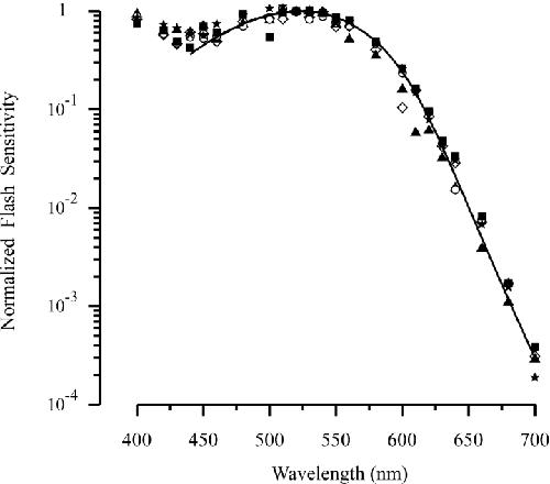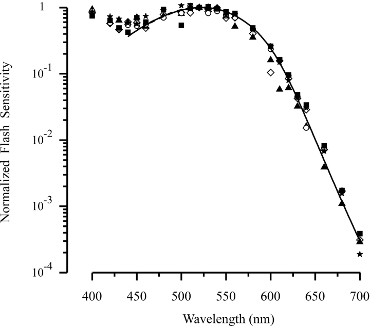 Figure 1. . Action spectra of Xenopus rods at different developmental stages. The normalized dim-flash sensitivity was calculated from r/IF (see text), and the sensitivity at 520 nm was then arbitrarily renormalized to unity. Data from one rod at each stage. Symbols: ○, stage 48; ▴, stage 50; ⋄, stage 55; ▪, stage 62; ★, frog at size of 2.5–5cm. Curve is drawn from Eq. 4. |
