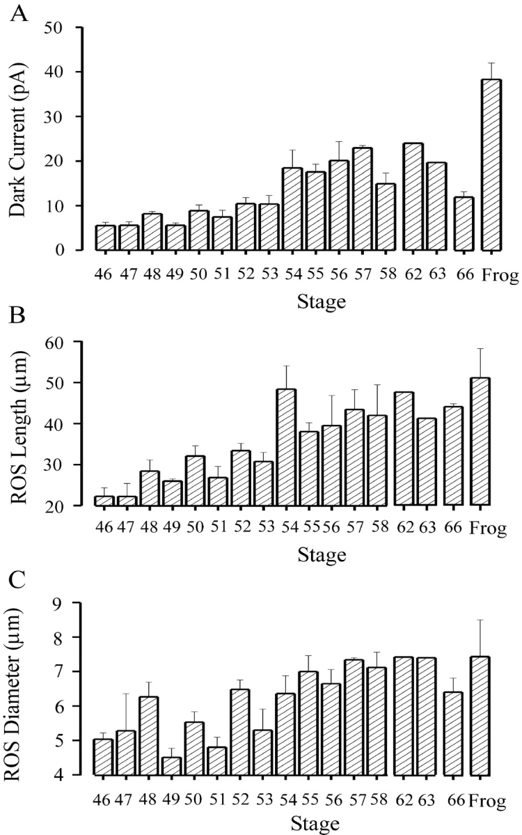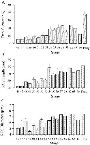 Figure 2. . Dark currents and physical dimensions of recorded rod outer segments (ROS) at different developmental stages. Results from tadpoles at stages 46–66 and frogs at sizes of 2.5–5cm. The histograms indicate averaged data and SEM. The number of rods studied at each stage were: 6(stage 46), 2(47), 5(48), 2(49), 10(50), 5(51), 9(52), 3(53), 4(54), 10(55), 5(56), 3(57), 4(58), 1(62), 1(63), 5(66) and 2(frog), respectively. |