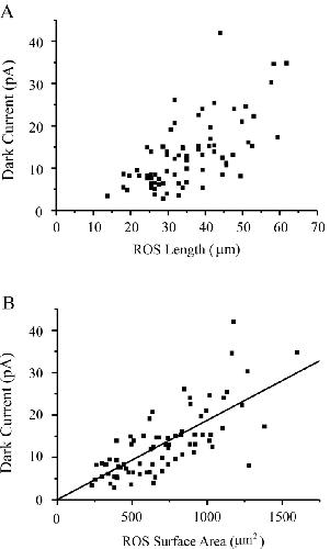 Figure 3. . Variation of dark current with rod outer segment length and surface area. Altogether, 77 cells from stage 46–66 tadpoles and young adult frogs. Solid line in B is a linear-regression line, with a slope of 0.0188 pA/μm2. |