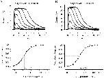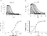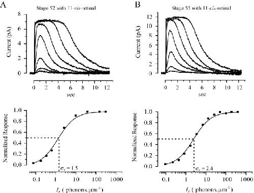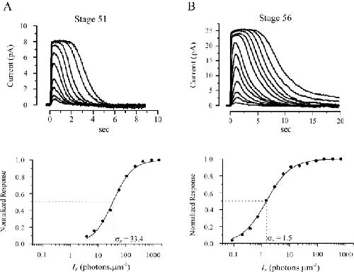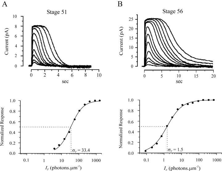 Figure 4. . Rod response properties at stages 51 and 56. In each case, top panel indicates flash response-intensity family from an overnight-dark-adapted rod, and bottom panel shows the relation between peak amplitude and flash intensity of the same cell. (A) Flash intensities were 3.86, 7.18, 14.67, 27.95, 57.07, 106.3, 216.9, 413.4, 844.1, and 1571.7 photons.μm−2, respectively. Light flash was delivered at time 0. The solid curve is Eq. 1 with σF equal 33.4 photons.μm−2. (B) Flash intensities were 0.09, 0.20, 0.39, 0.72, 1.47, 2.93, 5.99, 11.2, 22.8, 43.4, 90.5, 172.0, 352.9, and 693.7 photons.μm−2, respectively. The solid curve is Eq. 1 with σF equal 1.5 photons.μm−2. |