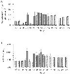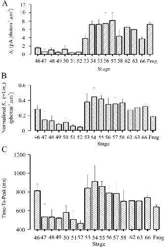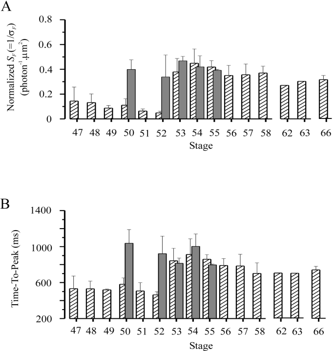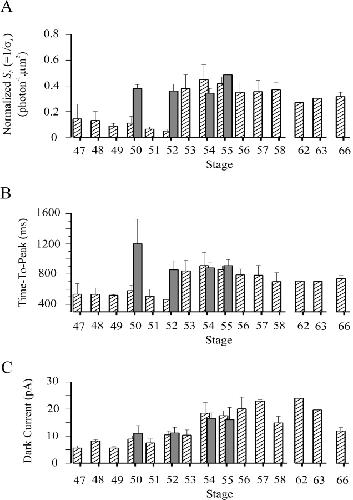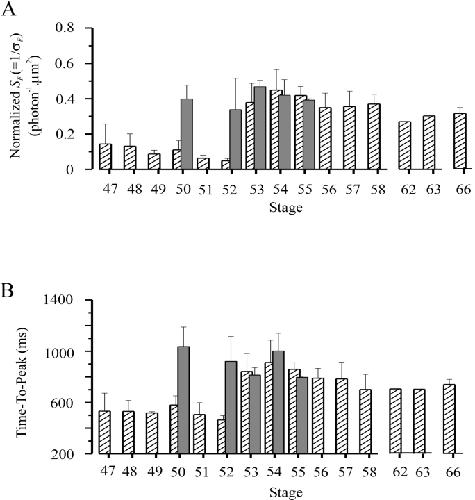 Figure 10. . Collected results on normalized flash sensitivity and time-to-peak of half-saturated flash response of rods after prolonged dark adaptation at various developmental stages. Dark bars indicate the collected results. The number of rods studied at each stage was: 3(stage 50), 2(stage 52), 3(stage 53), 5(stage 54) and 2(stage 55). Hatched bars are redrawn from Fig. 5, B and C. |