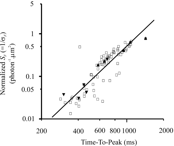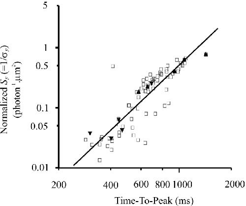 Figure 8. . Same power-law relation between normalized flash sensitivity and response time-to-peak during development as with light bleaches. Log-log coordinates. □, control, dark-adapted rods from different developmental stages; ▴, rods at stage 53 or later before bleaching (3 cells at stage 54, 1 at stage 56, and 1 at stage 58); ▾, the same cells after bleaching. The straight line fitted to the control rod data has a slope of 2.84. The cells marked by triangles are the same cells as those marked by filled squares in Fig. 9 (see Fig. 9 legend). |