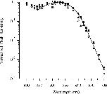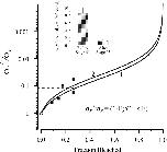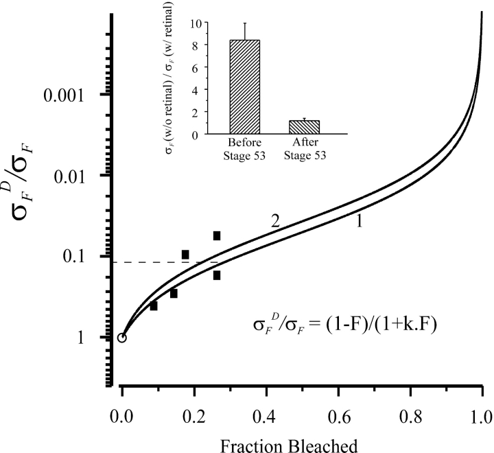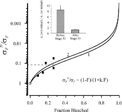 Figure 9. . Calculation of fractional free opsin in prestage 53 rods. The ratio of normalized flash sensitivity pre and postbleach, represented by , is plotted against fraction bleached and used as a standard, obtained from five poststage 53 cells indicated by filled squares. Same cells as those marked by triangles in Fig. 8; the point at zero fractional bleach (open circle) is simply a constraint for the curve fit. The stage, % bleach, and “steady-state” dark current before and after bleach of each cell were: stage 53, 17.5%, 13.9 pA, 7.5 pA; stage 54, 26.2%, 12.2 pA, 4.1 pA; stage 54, 14.3%, 30.3 pA, 17.1 pA; stage 55, 8.7%, 15.3 pA, 10.9 pA; stage 55, 26.2%, 15.3 pA, 10.4 pA. Continuous curves are Eq. 3 with k = 17.8 (Curve 1) and 25 (Curve 2). (Inset) Ratio of flash sensitivity with and without 11-cis-retinal treatment. 10 cells in total before stage 53 (4 at stage 50, 1 at stage 51, and 5 at stage 52) and 5 cells in total after stage 53 (3 at stage 54, 1 at stage 56, and 1 at stage 58). Sensitivity ratio before stage 53 being ∼8.5 and close to unity after stage 53. The reciprocal of 8.5 (horizontal dotted line) is used for estimating percentage of free opsin in prestage 53 rods, which gives 28% from Curve 1 and 22% from Curve 2. |