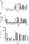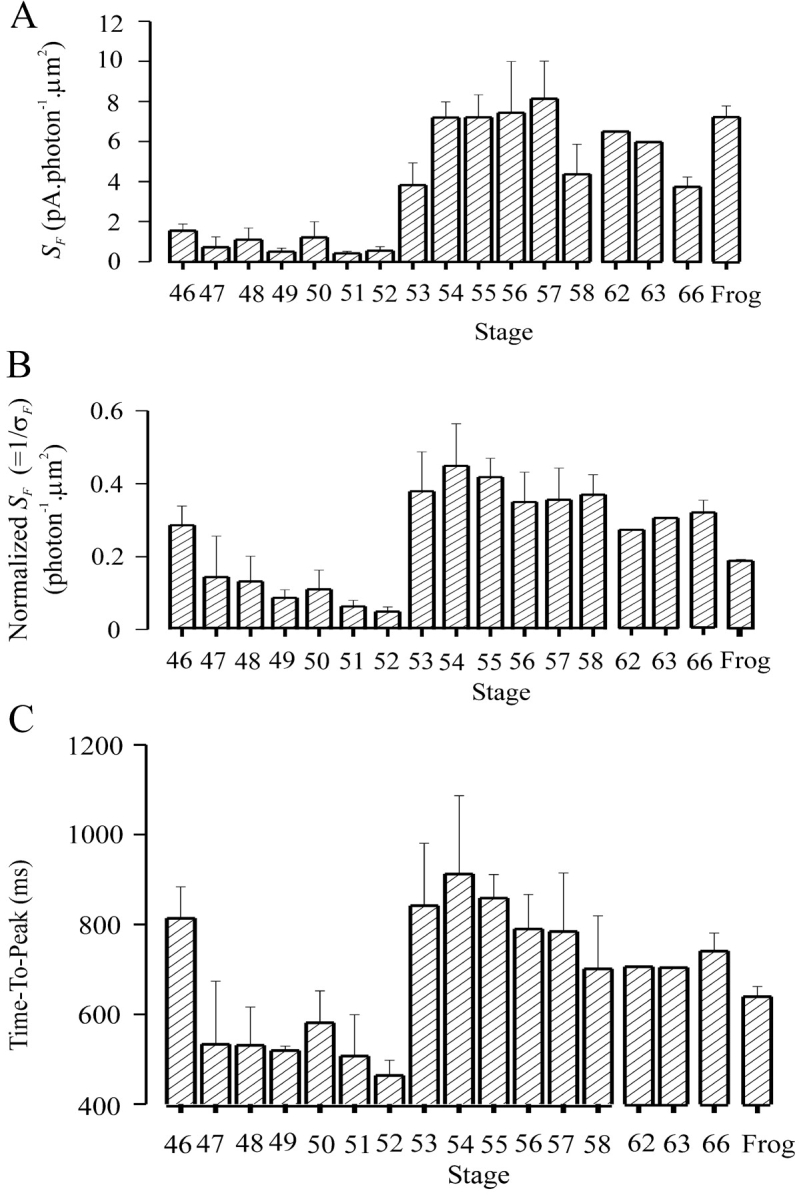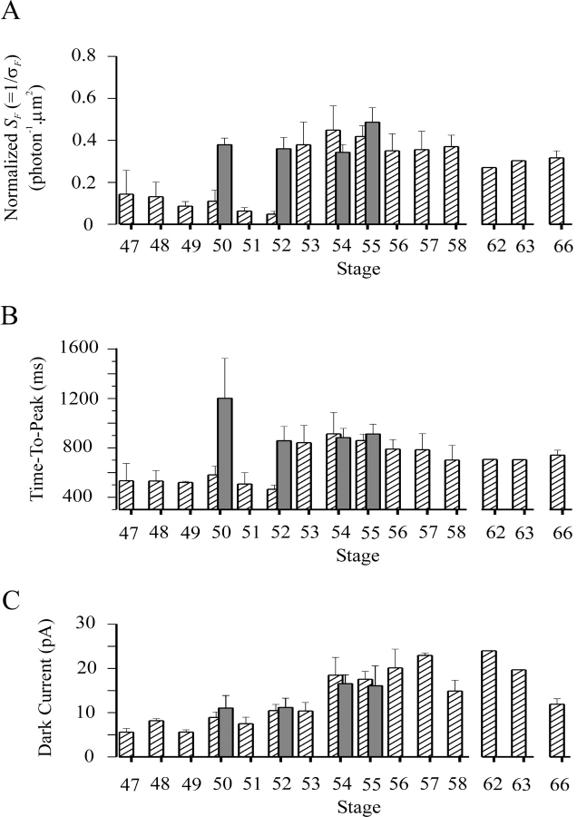 Figure 7. . Normalized flash sensitivity, time-to-peak of half-saturated flash response, and dark current at different developmental stages, after pretreatment of the isolated retina with 100 μM 11-cis-retinal for 40 min in darkness. Experiments on rods of overnight-dark-adapted tadpoles at stages 46–66 and frogs at sizes of 2.5–5 cm, as in Fig. 5. Dark bars indicate the collected chromophore-pretreatment data, showing average ± SEM. The number of rods measured at each stage are 4(stage 50), 6(52), 5(54) and 2(55). The hatch bars are redrawn from Figs. 5, B and C, and 2 A. |