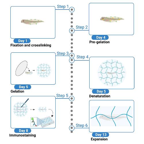 (D) Gel on day 14 before imaging. The trimmed gel measured 24 mm and was thus expanded by a factor 2. The total expansion factor is calculated by adding the factors for the two expansion stages, giving a final value of 4X.