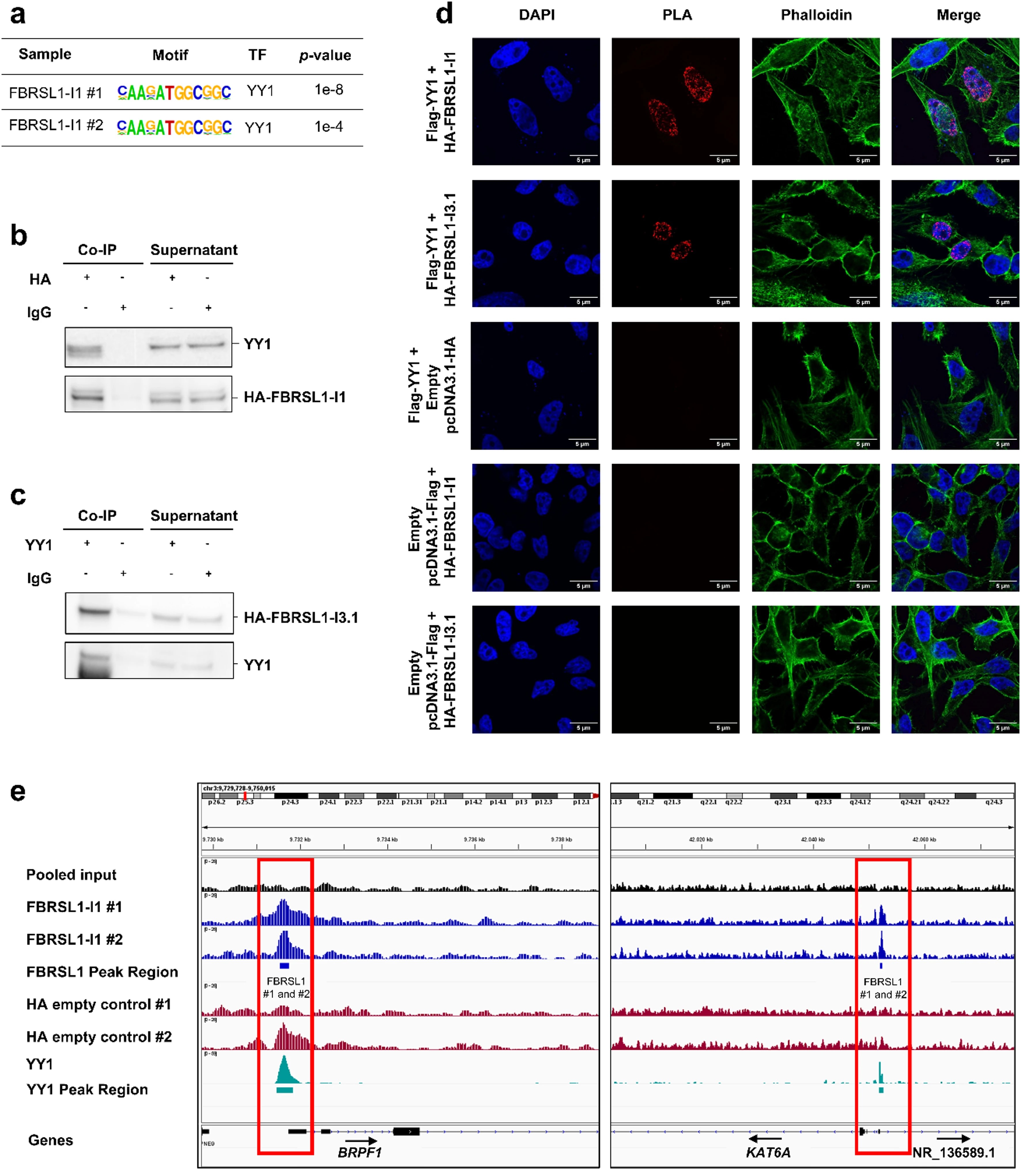 Fig. 2. FBRSL1 binds to upstream regions of protein-coding genes that overlap with the YY1 binding motif and physically associates with YY1. a HOMER Motif analysis revealed an enrichment of YY1 transcription factor motif in FBRSL1-I1 binding regions. b Co-immunoprecipitation in HEK293 cells showed an association of endogenous YY1 with overexpressed HA-FBRSL1-I1. c Co-immunoprecipitation in HEK293 cells showed an association of endogenous YY1 with overexpressed HA-FBRSL1-I3.1. d Proximity-ligation assay of FBRSL1 isoforms I1 and I3.1, and YY1 in HeLa cells. e Visualization of FBRSL1-I1 and YY1 ChIP-Seq peaks upstream of BRPF1 and KAT6A. Graphics were created using the Integrative Genome Browser (IGV) 2.9.4. TF transcription factor, Co-IP co-immunoprecipitation. |