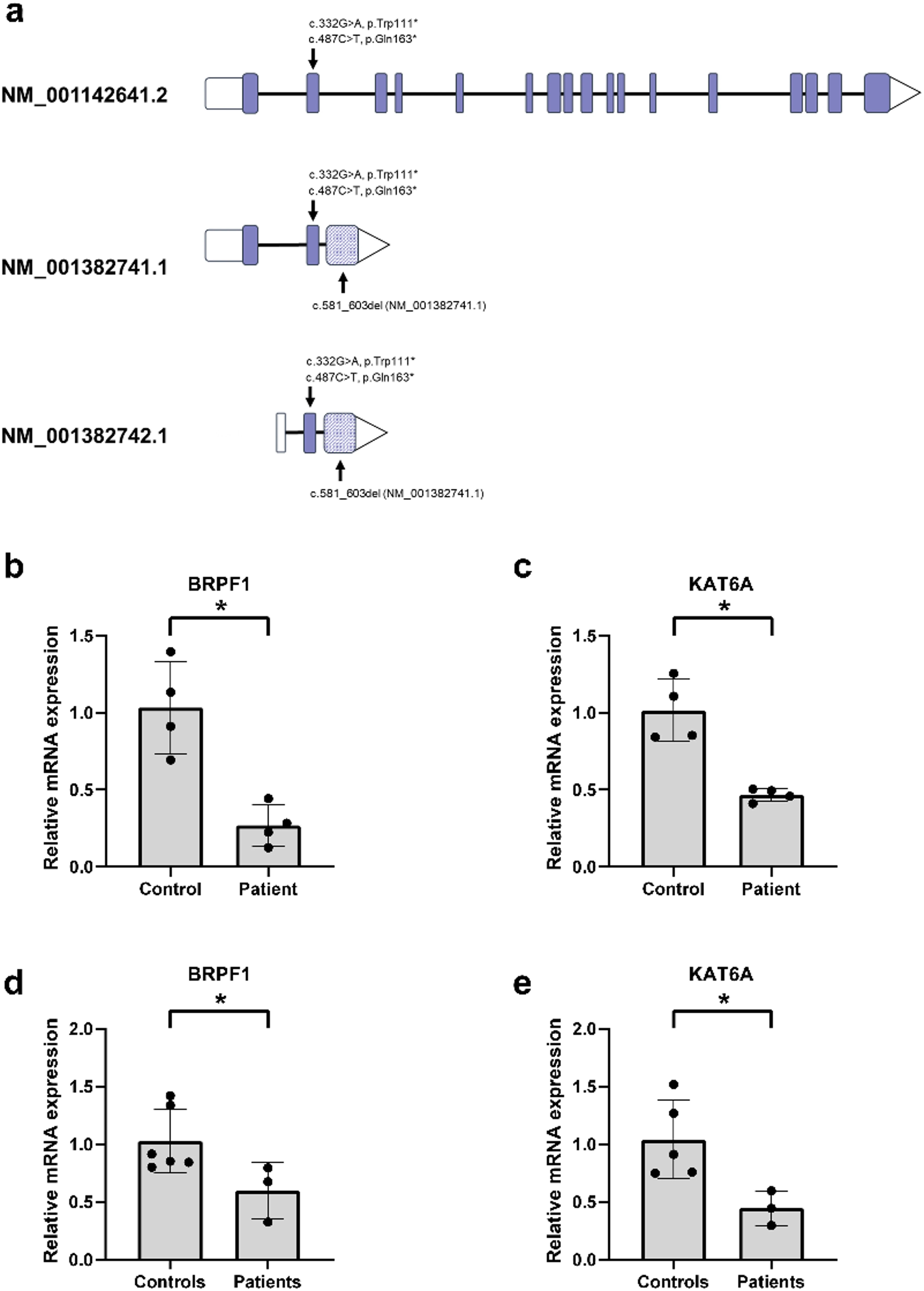 Fig. 3. Truncating FBRSL1 variants lead to a downregulation of its target genes in patient-derived fibroblasts. a Schematic presentation of the canonical long and the two short N-terminal FBRSL1 isoforms; truncating patient variants are indicated. Exon 3 (shaded) is an alternative exon ending with a stop codon, which is only present in the short N-terminal FBRSL1 isoforms. b, c qPCR analysis of FBRSL1 target genes in patient fibroblasts and healthy controls. Relative mRNA expression of (b) BRPF1 and (c) KAT6A in fibroblasts from one patient harboring the heterozygous FBRSL1 variant c.487C > T (p.Gln163*) compared to fibroblasts from a healthy control (n = 4). d, e qPCR analysis of FBRSL1 target genes (d) BRPF1 and (e) KAT6A in blood samples from three patients harboring heterozygous FBRSL1 variants c.487C > T (p.Gln163*), c.332G > A (p.Trp111*), and c.581_603del (n = 3) as well as the healthy controls (n = 5). The relative expression of target genes was determined using the 2−△△CT method. Mann-Whitney U test was performed for statistical analysis. A value of p ≤ 0.05 was considered as statistically significant (*)