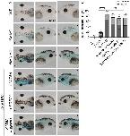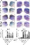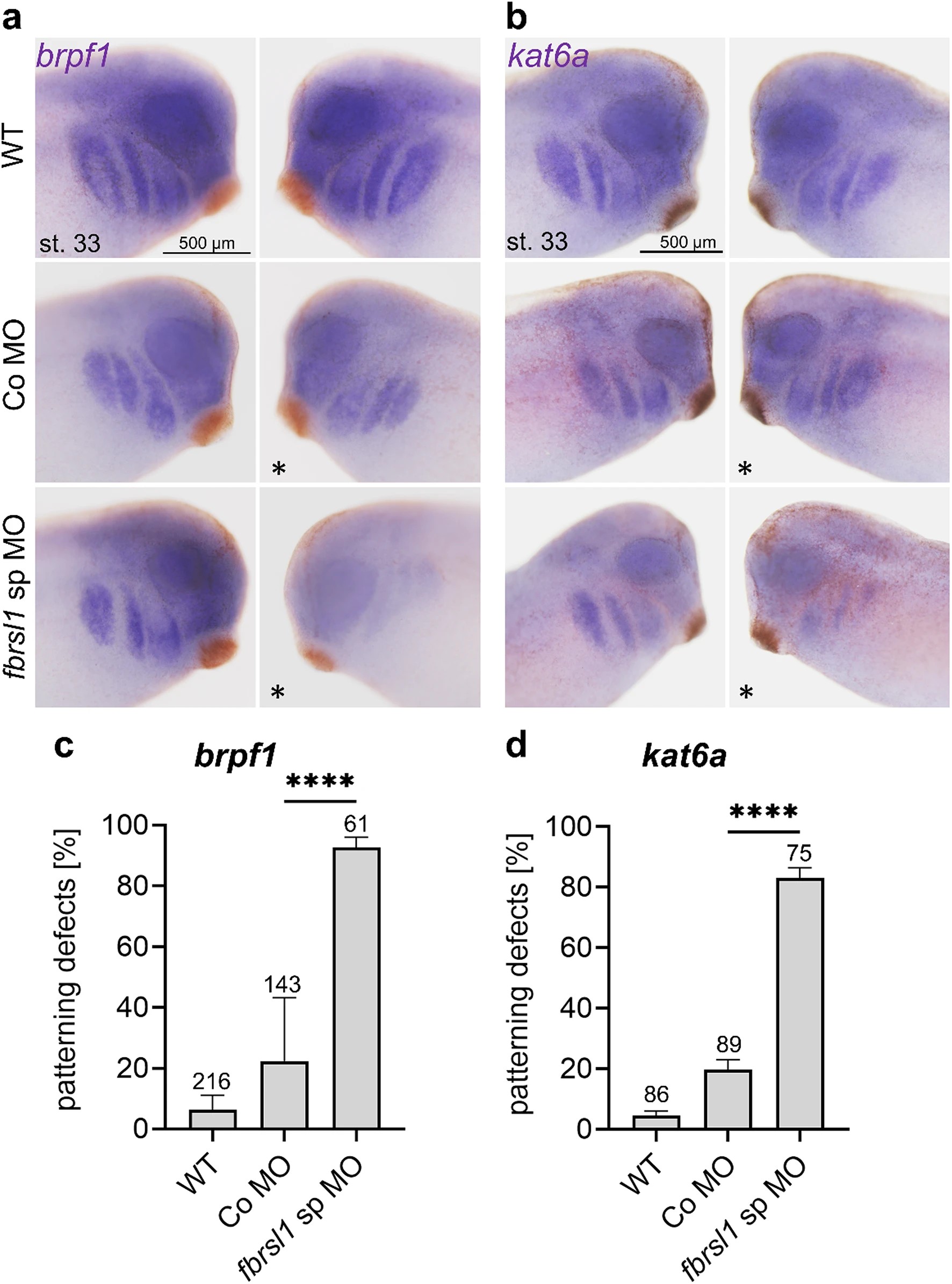 Fig. 4. Fbrsl1 depletion leads to defects in the brpf1 and kat6a expression pattern in Xenopus laevis embryos. Xenopus embryos were injected with 10 ng splice blocking fbrsl1 morpholino (fbrsl1 sp MO) or control morpholino (Co MO) together with 100 pg lacZ or 80 pg gfp mRNA as a lineage tracer in one blastomere at the two-cell stage. At tadpole stages (stage 33), the brpf1 or kat6a expression was analyzed by in situ hybridization. The injected side is indicated by a star. WT wild-type embryos. a, c Embryos analyzed for brpf1 expression. b, d Embryos analyzed for kat6a expression. c, d Graphs summarize brpf1 and kat6a patterning defects of four to six independent experiments. The bar charts show the mean value along with the standard error of the mean value. The number of embryos evaluated is indicated in all diagrams. One-way ANOVA followed by Tukeys post hoc test was used to evaluate statistical significance (****p0.0001). WT wild-type, st stage |
