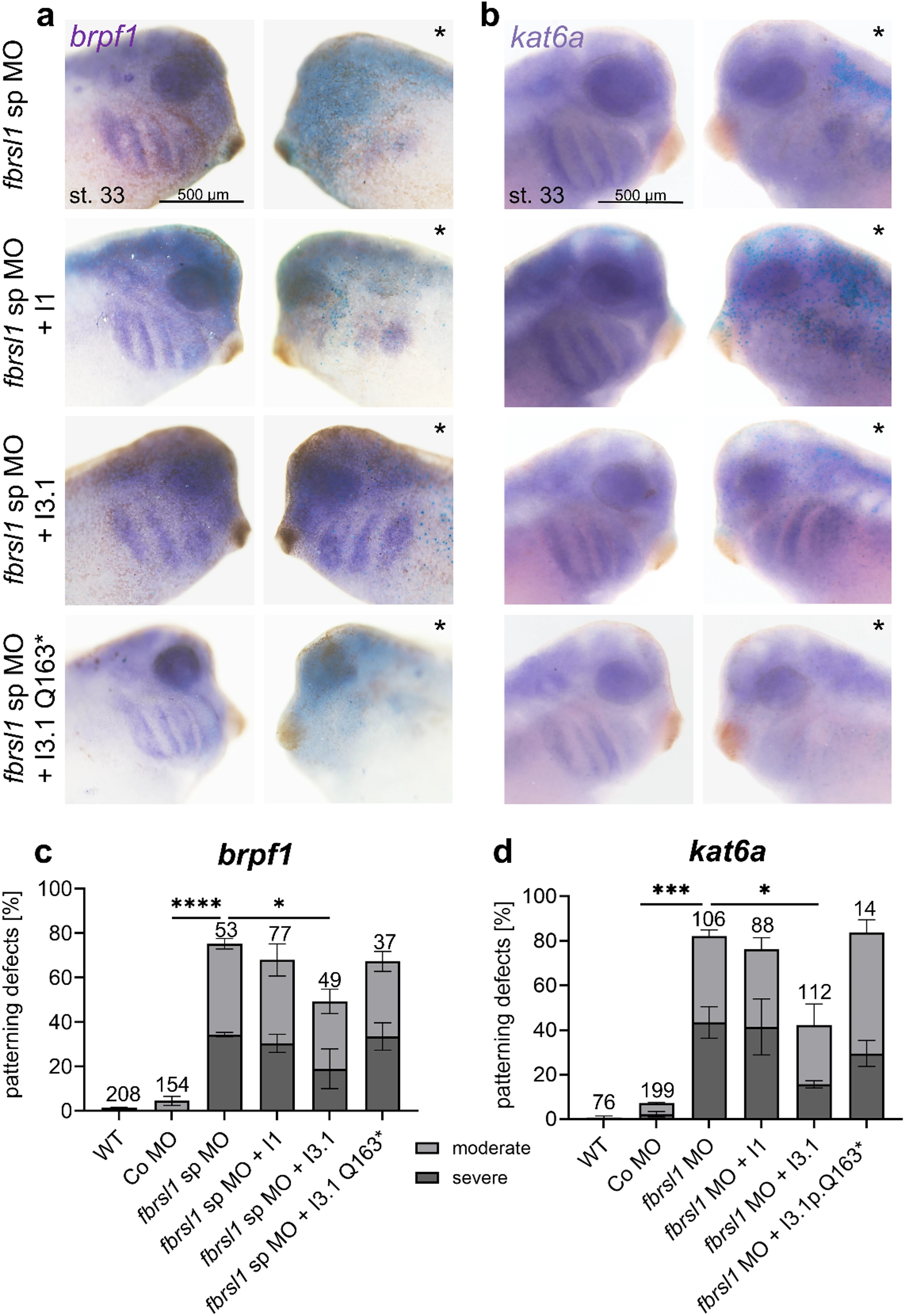 Fig. 5. Defects of brpf1 and kat6a expression patterns in Xenopus laevis morphant embryos can be rescued by co-injection of the short N-terminal fbrsl1 isoform I3.1. At the two-cell stage, Xenopus embryos were injected in one blastomere with 10 ng of either a splice blocking fbrsl1 morpholino (fbrsl1 sp MO) or a control morpholino (Co MO, see Fig. 4), along with 100 pg of lacZ mRNA as a lineage tracer. For rescue experiments, human FBRSL1 constructs I1 (NM_001142641.2) and I3.1 (NM_001382741.1) were co-injected. At tadpole stage (stage 33), brpf1 or kat6a expression was examined using in situ hybridization. The injected side is marked with a star. The short N-terminal isoform I3.1 significantly restores the patterning defects of brpf1 and kat6a, whereas the long isoform I1 and the short isoform, carrying one of the patient mutations (I3.1p.Q163*) did not rescue. a, c Embryos analyzed for brpf1 expression. b, d Embryos analyzed for kat6a expression. c, d Graphs summarize brpf1 and kat6a patterning defects. The bar charts show the mean value along with the standard error of the mean value. The number of embryos evaluated is indicated in all diagrams. One-way ANOVA followed by Tukeys post hoc test was used to evaluate statistical significance (*p0.05, ***p0.001, ****p0.0001). WT wild-type, st stage |