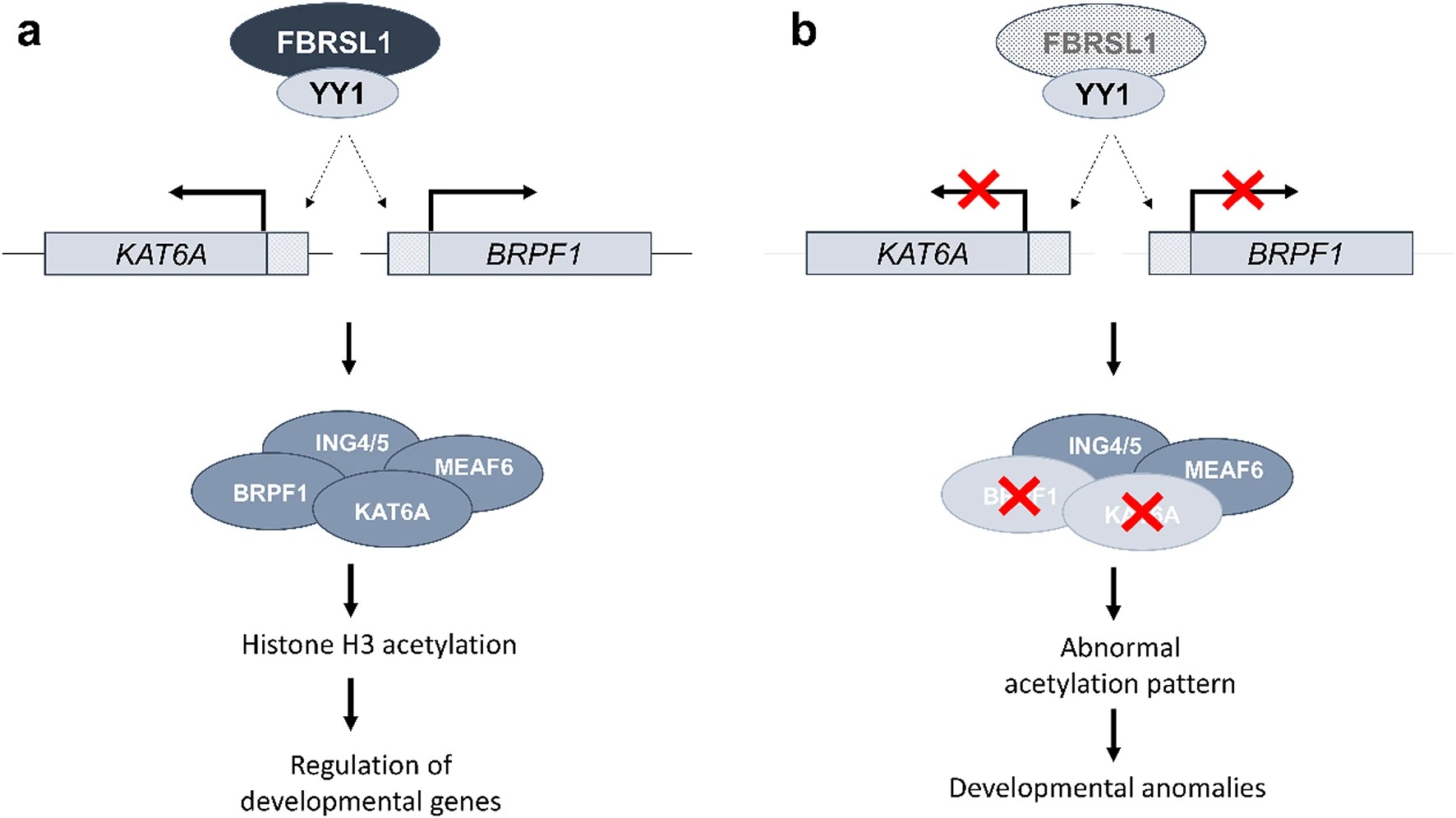 Fig. 7. Hypothetical model of FBRSL1-mediated regulation of chromatin regulators BRPF1 and KAT6A and their dysregulation in patients with truncating FBRSL1 variants. a FBRSL1 regulates the expression of BRPF1 and KAT6A, likely through its association with YY1. Along with ING4/5 and MEAF6, BRPF1 and KAT6A build the chromatin modifying BRPF1-KAT6A complex that controls the expression of developmental genes via histone H3 acetylation. b Truncating variants in FBRSL1 (shaded) lead to a downregulation of BRPF1 and KAT6A and therefore insufficient BRPF1-KAT6A complex activity. This likely causes an abnormal acetylation pattern and subsequently developmental abnormalities |