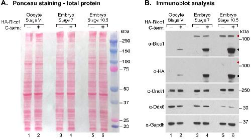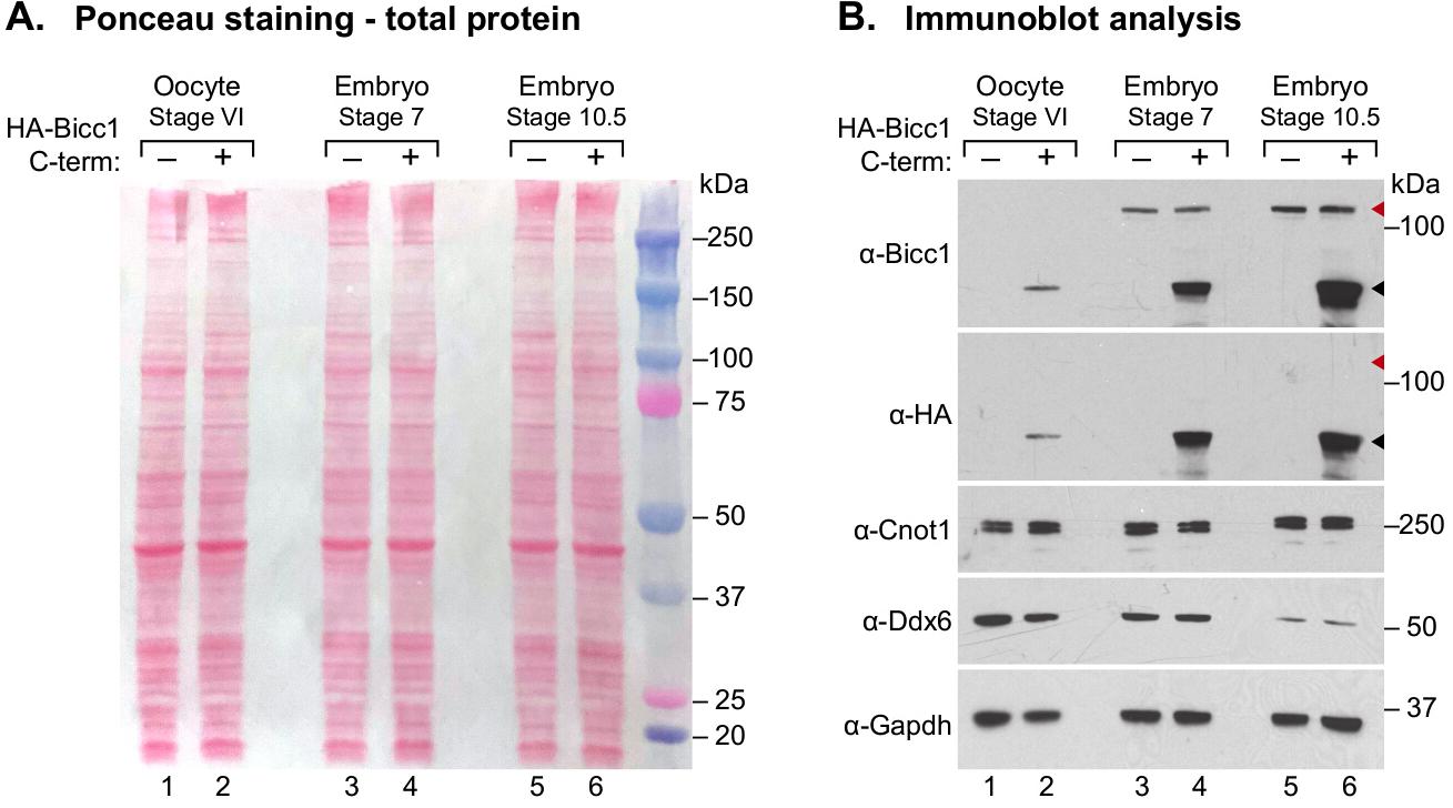 Figure 3: Identifying levels of translational regulatory proteins through immunoblotting in X. laevis. (A) Ponceau staining of the immunoblot to identify total protein from X. laevis stage VI oocytes, stage 7 embryos, and stage 10.5 embryos. Each lane represents 10% of the protein prepared from an extract (0.5 oocyte or embryo). (B) Immunoblot analysis of selected X. laevis translational regulatory proteins in stage VI oocytes, stage 7 embryos, and stage 10.5 embryos. Lanes 2, 4, and 6 correspond to samples microinjected with HA-Bicc1 mRNA prior to analysis, while lanes 1, 3, and 5 serve as negative (uninjected) controls. α-Bicc1 antibody was used to assay expression of endogenous Bicc1 across stages (top panel). The blot was subsequently stripped and re-probed with an antibody to the HA affinity tag as a control for α-Bicc1 antibody specificity (second panel). Blots were stripped and re-probed for additional regulatory proteins using α-Cnot1 (third panel) and α-Ddx6 (fourth panel). α-Gapdh (bottom panel) served as a control for equal protein loading. Red arrowheads mark the location of endogenous Bicc1, while black arrowheads mark the location of exogenously expressed HA-Bicc1 C-term.