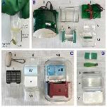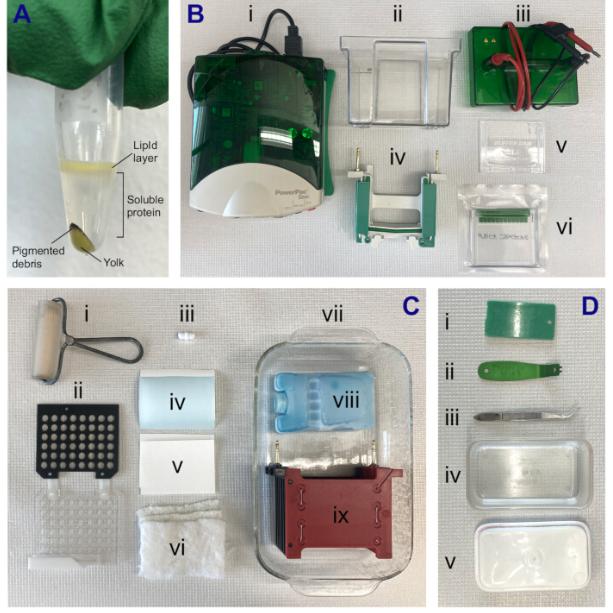Figure 2: Processed embryo extract and equipment for immunoblotting. (A) Centrifuged X. laevis stage VI oocyte extract. Lipids and fat-soluble proteins rise to the top while vitellogenin (yolk) and pigmented debris form a pellet. (B) Equipment for SDS-PAGE to separate proteins by molecular weight. (i) Power supply, (ii) Vertical electrophoresis tank, (iii) Electrophoresis tank lid, (iv) Electrode assembly, (v) Buffer dam, (vi) Precast electrophoresis gel; note the green comb (top) and blue sticker (bottom), each of which must be removed. (C) Equipment for membrane transfer. The vertical electrophoresis tank and lid are reused for transfer after a thorough rinse. (i) Roller to remove bubbles, (ii) Transfer clip, (iii) Small stir bar, (iv) Nitrocellulose membrane in between two protective blue sheets of paper, (v) Cellulose chromatography filter paper, (vi) Transfer sponge cushions, (vii) Glass baking dish for transfer assembly, (viii) Ice pack, (ix) Transfer core. (D) Other equipment. (i) Gel releaser (for trimming gel wells pre-transfer), (ii) Gel cassette opening lever, (iii) Forceps (for handling membrane), (iv) Container (for holding membrane), (v) container lid.