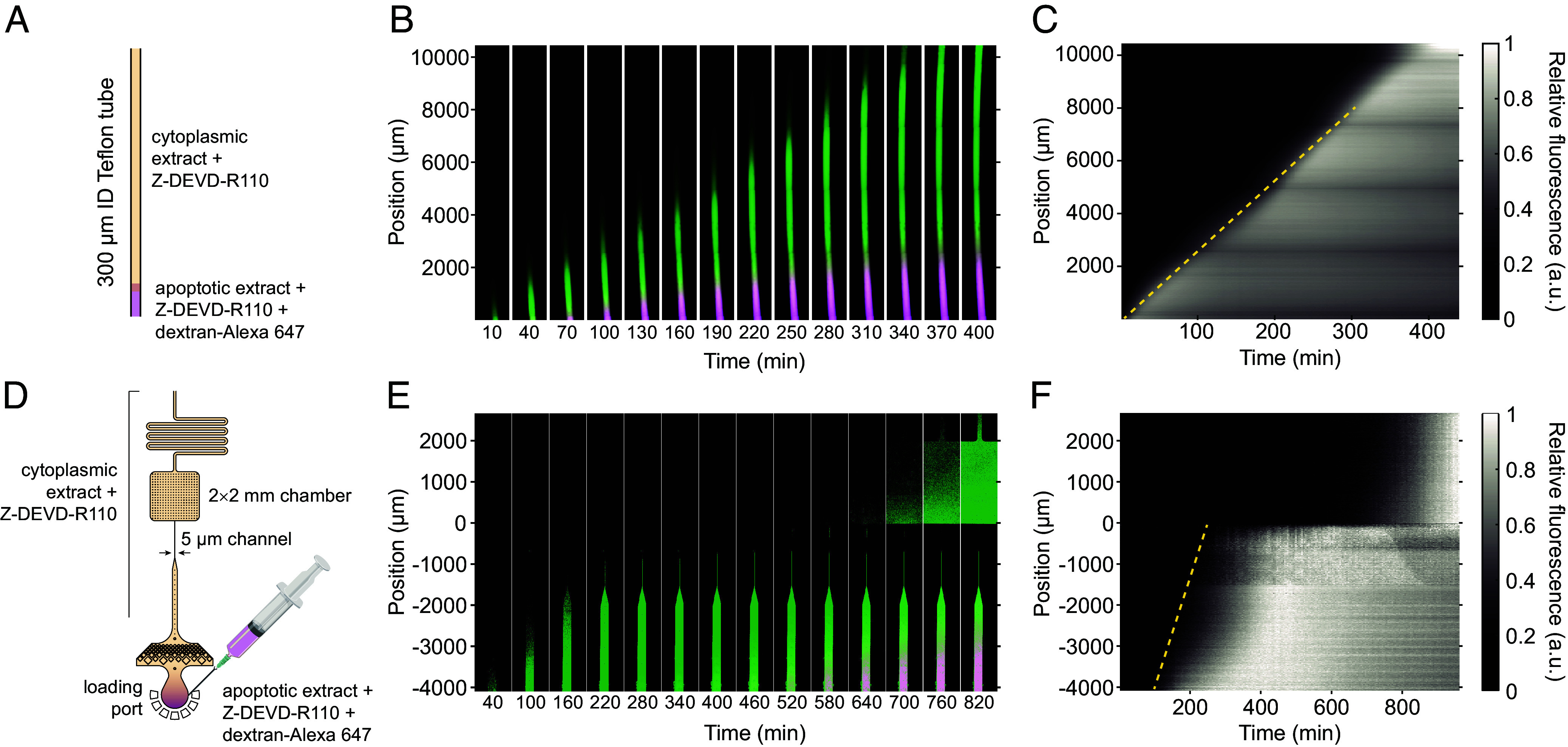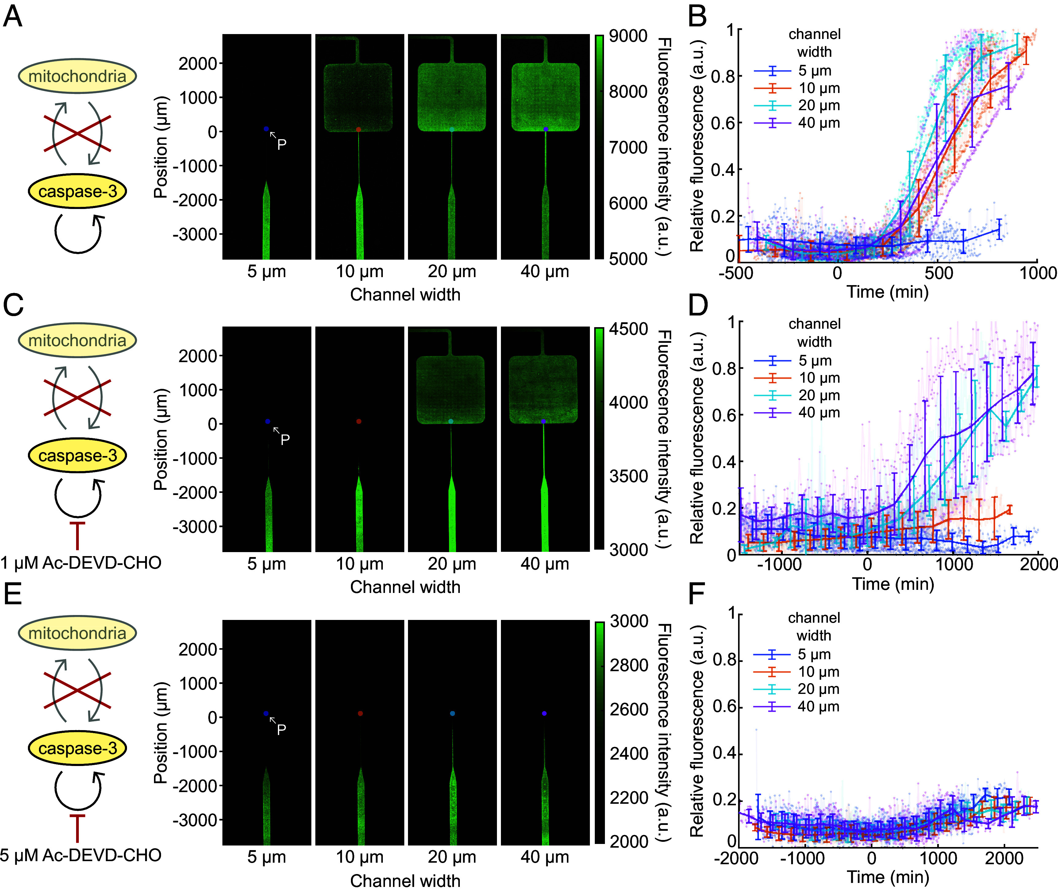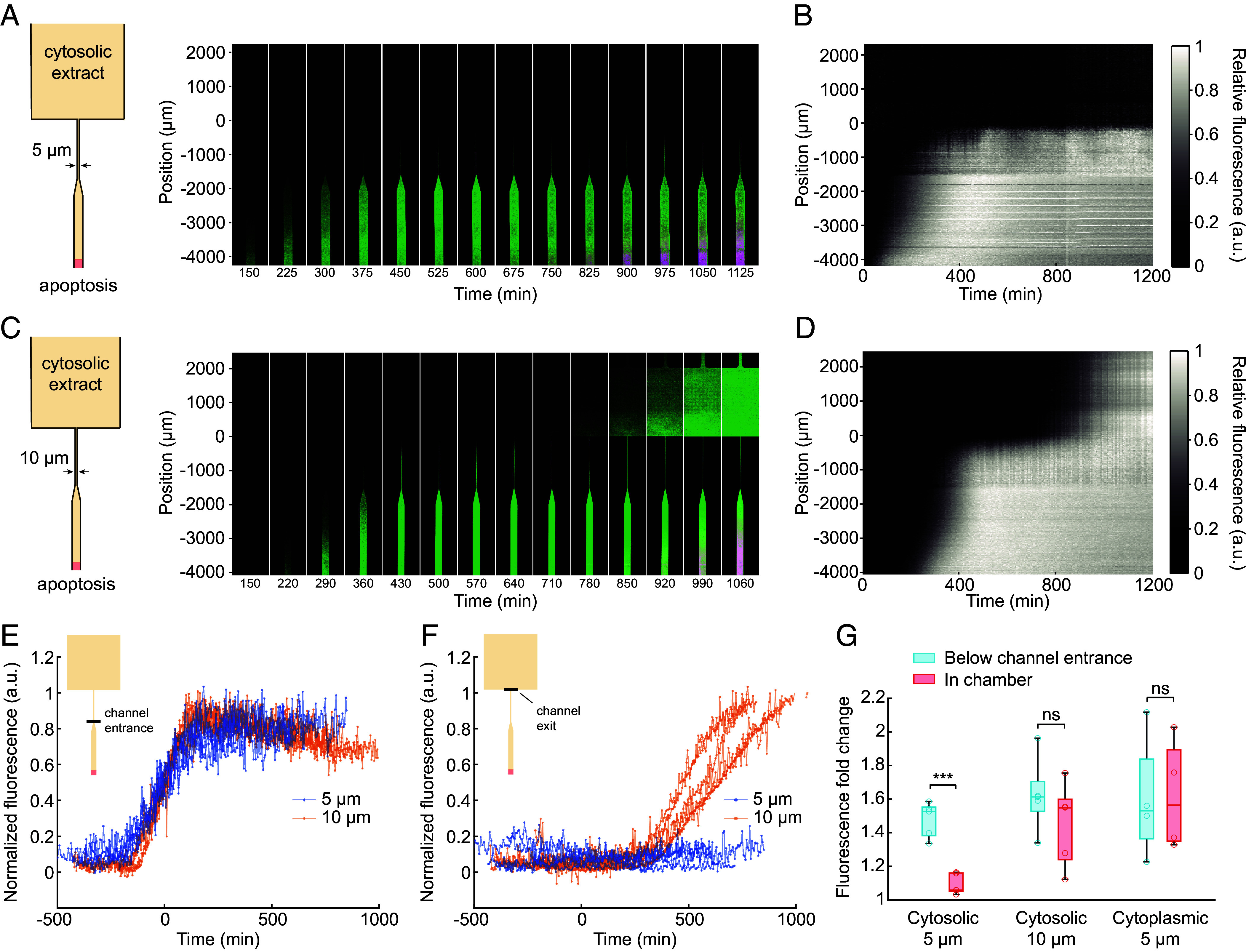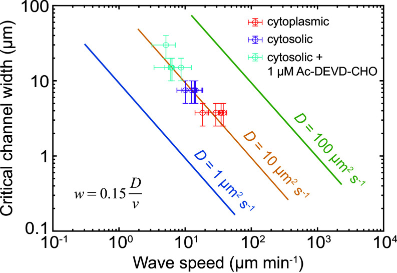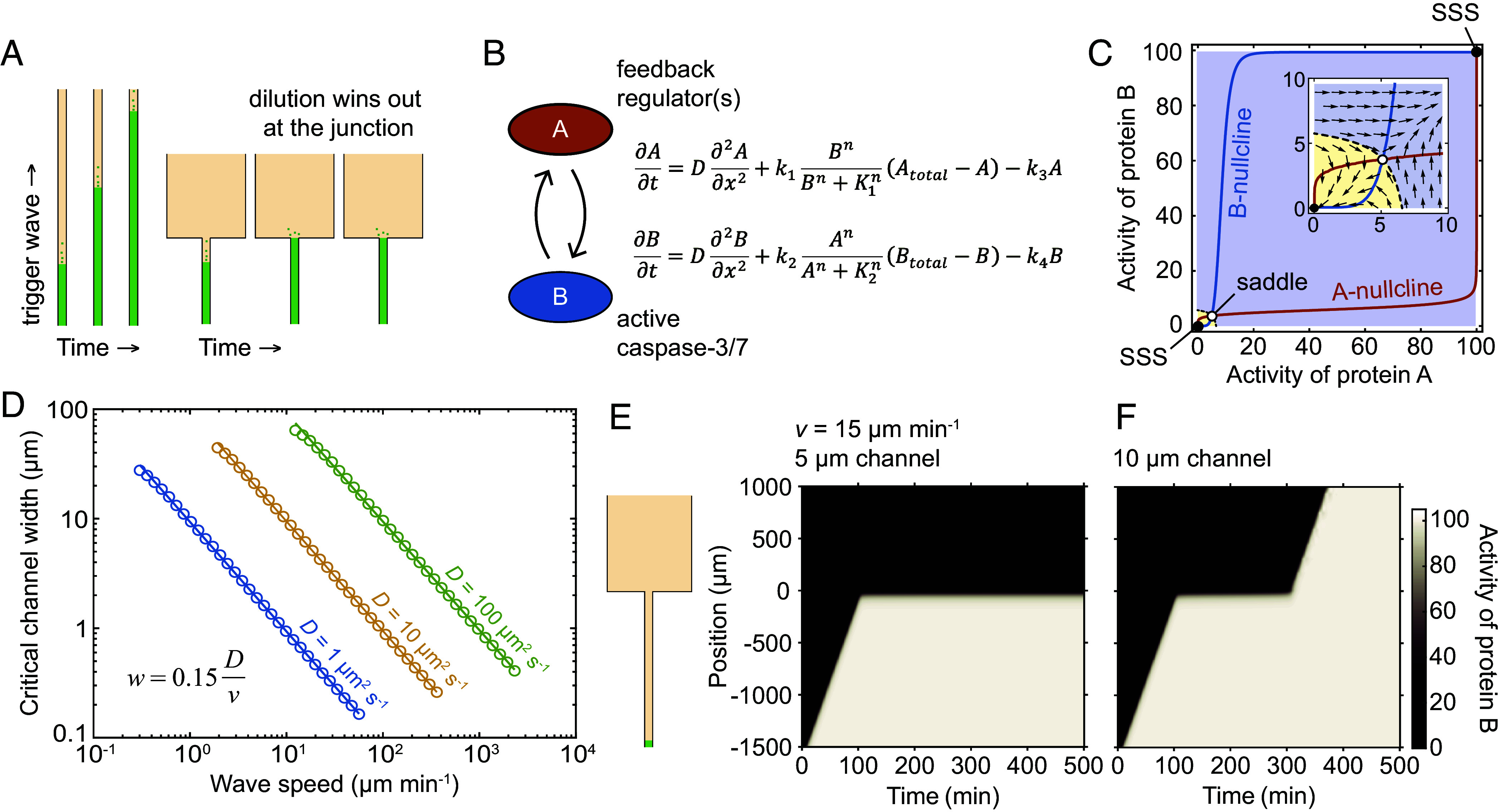 Trigger waves, self-regenerating fronts of biochemical activity that spread without losing speed or amplitude, are widespread in cell signaling. Apoptosis is one example of a process that propagates through the cytoplasm via trigger waves. Curiously, in some contexts, like synaptic pruning, apoptotic caspase activation is confined to specific subcellular regions. We hypothesized that at junctions between a thin cytoplasmic extension, like a dendritic spine, and a thicker one, like a dendrite, trigger wave propagation may be blocked even though diffusion is not, as a result of the general properties of trigger waves and bistable systems. This hypothesis was explored theoretically through modeling studies and dimensional arguments, which confirmed that trigger wave compartmentalization was possible and that the critical channel width required for compartmentalization was likely to be biologically relevant. These predictions were then tested experimentally with undiluted Xenopus egg extracts that were induced to undergo apoptosis. We found that channels that are less than a few microns in diameter are small enough to compartmentalize apoptosis, and that the critical width is inversely proportional to trigger wave speed. Thus, cellular projections and tubules can allow for the compartmentalization of biochemical states within a spatially continuous cytoplasm, a fundamental yet previously overlooked mechanism for controlling biochemical signaling and cellular functions.