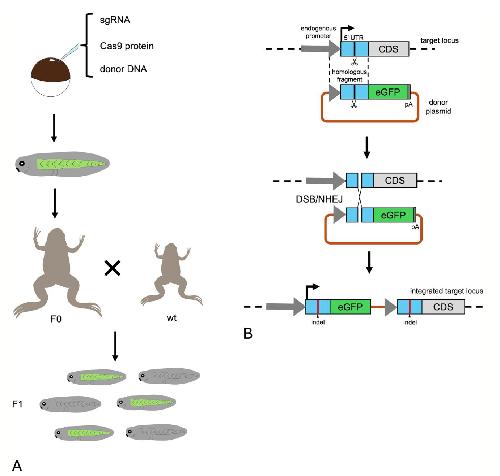 We established a novel knock-in technique, New and Easy Xenopus Targeted integration (NEXTi), to recapitulate endogenous gene expression by reporter expression. NEXTi is a CRISPR-Cas9-based method to integrate a donor DNA containing a reporter gene (egfp) into the target 5' untranslated region (UTR) of the Xenopus laevis genome. It enables us to track eGFP expression under the regulation of endogenous promoter/enhancer activities. We obtained about 2% to 13% of knock-in vector-injected embryos showing eGFP signal in a tissue-specific manner, targeting krt.12.2.L, myod1.S, sox2.L, and bcan.S loci, as previously reported. In addition, F1 embryos which show stable eGFP signals were obtained by outcrossing the matured injected frogs with wild-type animals. Integrations of donor DNAs into target 5' UTRs were confirmed by PCR amplification and sequencing. Here, we describe the step-by-step protocol for preparation of donor DNA and single guide RNA, microinjection, and genotyping of F1 animals for the NEXTi procedure.