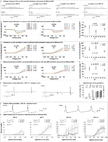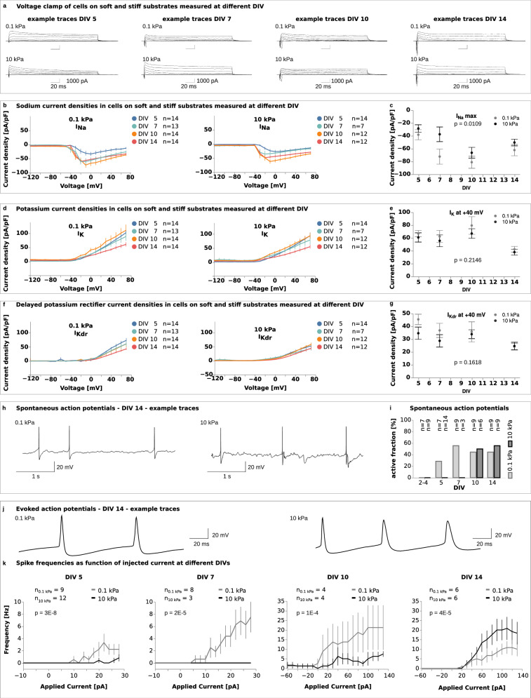 Fig. 2. Neuronal activity is lower on stiff substrates than on soft substrates.a Example traces from voltage-clamp recordings showing induced currents in cells on soft (0.1 kPa) and stiff (10 kPa) substrates at DIV 5, 7, 10, and 14. b, c Current densities for voltage-gated sodium (INa) channels were calculated from whole-cell voltage-clamp recordings, as shown in (a). c Peak sodium current densities were significantly lower on stiff substrates, indicating delayed maturation (two-way ANOVA, time points and substrate stiffness as factors). Cell numbers are identical in (b) and (c). Current densities for voltage-gated potassium channels (d, e IK, f, g IKdr) calculated from whole-cell voltage-clamp recordings, as shown in (a). e, g Current densities at +40 mV were similar between the stiffnesses at all time points (two-way ANOVA). Cell numbers are identical in (d–g). h Representative traces of spontaneous action potentials (APs) recorded by whole-cell patch-clamp electrophysiology at DIV 14. i Plot of spontaneous activity. A cell was considered active if it produced at least one action potential during the recording. On soft gels, spontaneous APs were detected from DIV 5 until the end of the culture period, whilst neurons on stiff gels did not show any spontaneous activity until DIV 10. At DIVs 10 and 14, cells showed similar levels of activity regardless of the environmental stiffness, suggesting that the electrical maturation of neurons was delayed on stiffer substrates. j Representative traces of APs evoked in whole-cell current-clamp recordings at DIV 14. k F–I curves showing AP frequencies as a function of the injected current. Neuronal excitability on soft and stiff substrates was evaluated using a two-way ANOVA, with applied current and substrate stiffness as factors. Excitability was significantly higher on soft substrates than on stiff ones between DIV 5–10; this trend reversed at DIV 14. b, d, f, k Line plots represent mean values, error bars the standard error of the mean (SEM). c, e, g Plots represent means, error bars the SEM. |