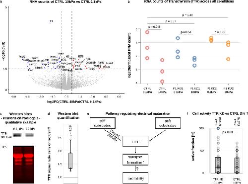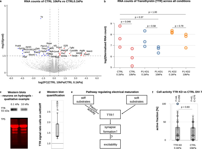 Fig. 4. Transthyretin (TTR) regulates electrical maturation of neurons downstream of Piezo1.a Volcano plot of RNA-sequencing results of CTRL neurons grown on soft vs. stiff substrates at DIV 7. Foldchange is shown on the x-axis (blue: higher expression on soft, red: higher expression on stiff gels), p-values on the y-axis. Statistical significance was assessed using the DESeq2 two-sided Wald test. The volcano plot displays unadjusted p-values. The most significant change between the conditions was observed in TTR levels. b