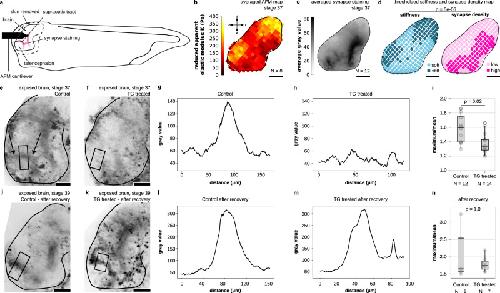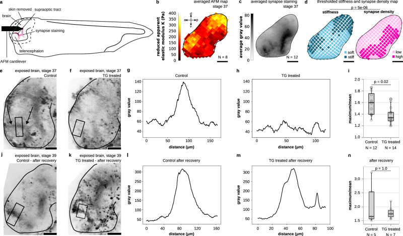 Fig. 5. Synapse formation is delayed in stiffer brain tissue in vivo.a Schematic of a Xenopus laevis embryo whose brain was exposed, enabling stiffness measurements by AFM and fluorescence imaging of functional synapses (indicated in pink). b Average stiffness map of Xenopus laevis brains at stages 37–38. c Averaged FM1-43 fluorescence image indicating synapse locations. d Binary maps of average tissue stiffness and synaptic density (see “Methods” section). Stiffness negatively correlated with synaptic density (p = 5 × 10⁻⁶, two-sided Fisher’s exact test). The odds ratio was 0.25, indicating that synapses were four times more likely to form in soft regions than in stiff ones. e, f, j, k Images of exposed Xenopus laevis brains; synapses were stained using FM1-43. e At stage 37–38, a typical staining pattern was found in the area of the supraoptic tract (arrows). f In stiffened brains (cf. Supplementary Fig. 15), this pattern was largely absent. g, h Intensity profiles along the stripes indicated in (e, f). While the untreated brain showed a strong peak, the TG profile was noise-dominated. i The ratio of the maximum over the mean value in each profile was significantly higher in control brains than in stiffened brains (two-sided Mann–Whitney test), indicating more functional synapses in softer brains. j, k After a recovery period of 8 h, strong signals in the area of the supraoptic tract were visible in either condition, suggesting that synapse formation was delayed in the stiffened brains. l, m Line profiles show very similar features between the two conditions at stage 39. n The ratio of the maximum value over the mean value showed no significant difference at stage 39 (two-sided Mann–Whitney test). Boxplots show the median (central line), the interquartile range (box), and whiskers represent 1.5 times the interquartile range. Scale bars: 100 μm. |