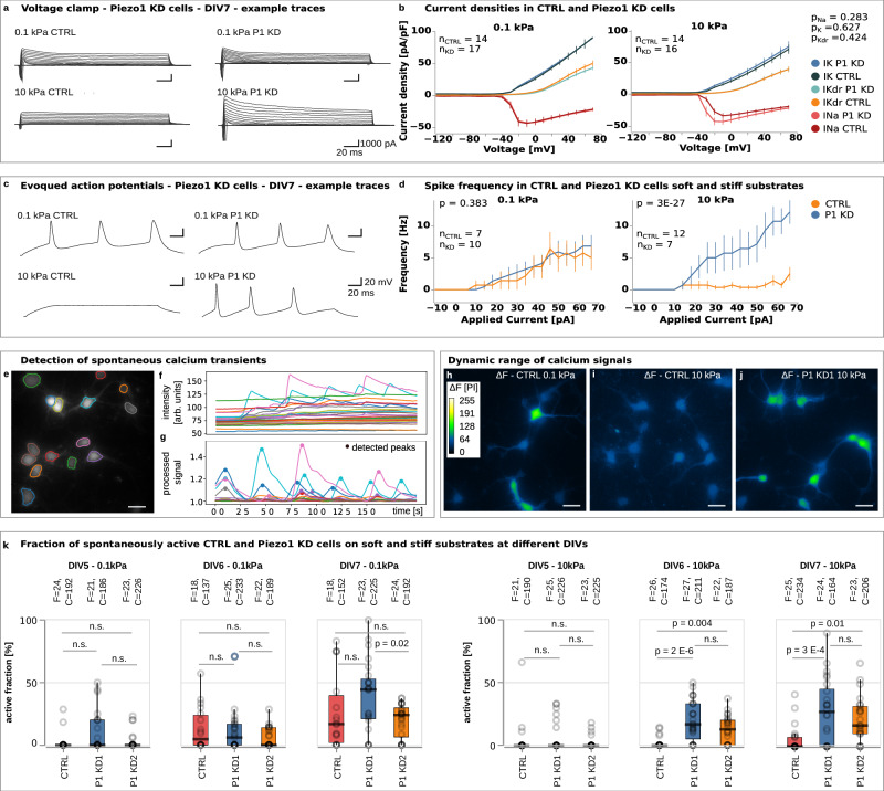 Fig. 3. Piezo1 delays the electrical maturation of neurons on stiff substrates.a Example traces of voltage-clamp recordings showing induced currents in control and Piezo1 knockdown (P1 KD) cells on soft and stiff substrates at DIV 7. b Potassium current densities on soft and stiff substrates and sodium current densities on soft substrates were similar between control and P1 KD cells. On stiff substrates, control cells showed a trend towards lower peak sodium current densities compared to P1 KD cells, suggesting a Piezo1-dependent delay in maturation (see Fig. 2b), though not statistically significant (ANOVA and Sidak’s multiple comparisons test). c Representative traces of evoked action potentials recorded at DIV 7. d Analysis of spike frequencies as a function of injected current. While control and P1 KD cells displayed similar excitability on soft substrates, control neurons exhibited significantly reduced excitability on stiff substrates compared to P1 KD neurons (two-way ANOVA, factors: applied current and genetic condition), further supporting the idea of a Piezo1-dependent delay in neuronal maturation on stiff substrates. p-values are indicated in the plots. e Image of Rhod-4-loaded neurons, with semi-automatically labelled somata, and soma fluorescence intensities. f Plot of the baseline-corrected intensity of each cell over time. g Filtered signals with automatic peak detection. Colour-coded images showing intensity changes ΔF over 40 s. CTRL cells on h soft substrates showed strong variability, whereas i low fluctuations on stiff substrates indicated little neuronal activity. j Knockdown of Piezo1 rescued the spontaneous activity of neurons on stiff gels. k Active fraction of cells as a function of substrate and time. Cells were considered active if they produced at least one calcium transient (“F” = fields of view, “C” = number of cells). CTRL neurons (red) on soft substrates became active by DIV 5–6 but showed little activity on stiff substrates until DIV 7. Knockdown of Piezo1 (blue and yellow) rescued the activity of neurons on stiff substrates (Kruskal–Wallis test and two-sided Tukey test), confirming that Piezo1 activity delayed the electrical activity of neurons on stiff substrates. Boxplots show the medians (central line) and interquartile ranges (boxes); whiskers represent 1.5 times the interquartile range. Scale bars: 25 μm. See also Supplementary Movies 1–4. |