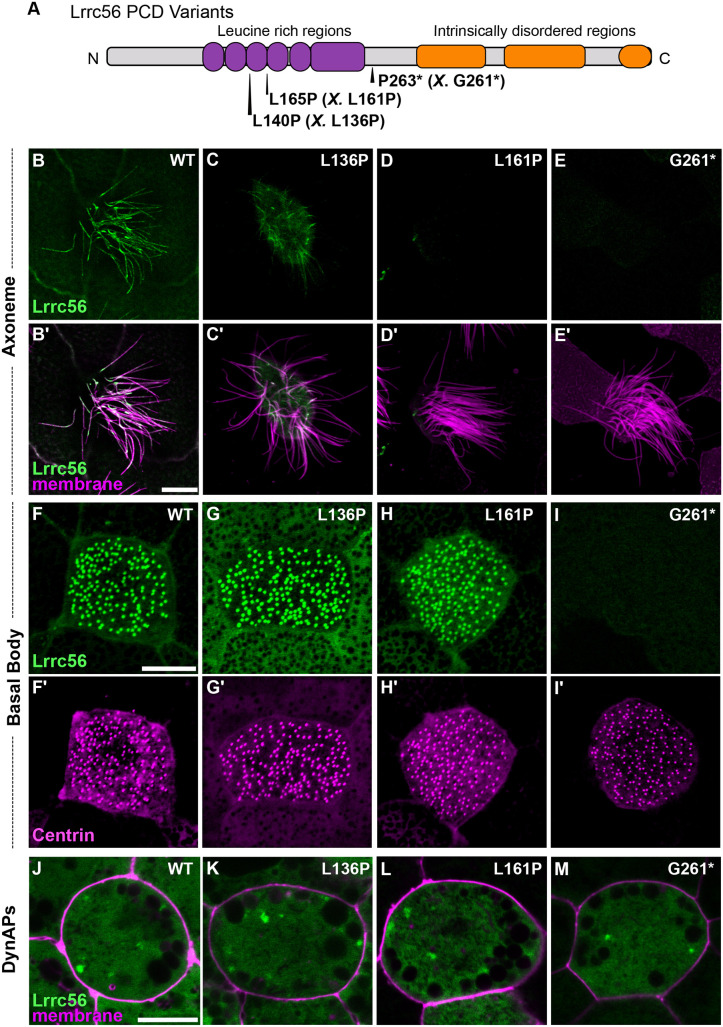 Primary ciliary dyskinesia (PCD) is a genetically heterogeneous motile ciliopathy characterized by chronic respiratory disease, laterality defects, hydrocephalus, and infertility, caused by impaired function of motile cilia. LRRC56 has recently emerged as a novel PCD candidate gene, but its role in vertebrate cilia remains poorly understood. Here, we used Xenopus laevis multiciliated cells, targeted knockdown, and in vivo imaging to investigate Lrrc56 function, and combined these studies with in vivo affinity purification-mass spectrometry (AP-MS) to define its interactome. We show that loss of lrrc56 causes specific depletion of outer dynein arms (ODAs) from the distal axoneme. In vivo AP-MS revealed that Lrrc56 binds the ODA docking complex components, including Odad3. Consistently, Lrrc56 knockdown also led to distal loss of Odad3. Moreover, we show that disease-associated variants in LRRC56 and ODAD3 disrupted their localization and interaction, pointing to a shared functional pathway. Our work demonstrates that Lrrc56 is a critical regulator of distal ODAs and ODA docking complex deployment and provides new mechanistic insight into PCD, advancing our broader understanding of motile cilia biology.