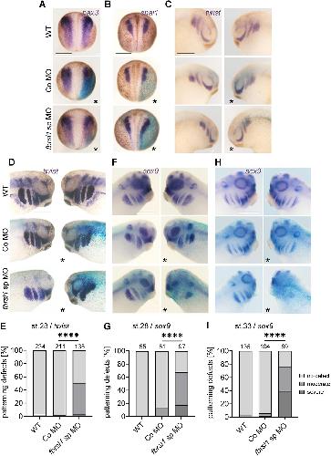 Fig. 1. Fbrsl1 loss of function does not affect NC induction, specification and early migration, but later stages of NC development. Embryos were uninjected, injected with 15 ng Co MO or injected with 10 ng fbrsl1 sp MO and 80-100 pg lacZ mRNA at the two-cell stage and analyzed by whole-mount in situ hybridization using NC markers as indicated. Asterisks indicate the injected side, which is also visible by the blue LacZ staining. WT, wild type (uninjected control). Scale bars: 500 µm. (A) Dorsal views of a stage 14 embryos analyzed for expression of the neural plate border marker pax3. (B) Dorsal views of stage 16 embryos analyzed for the expression of snai1, indicating premigratory NC cells. (C) Lateral views of stage 23 embryos showing early migrating NC cells marked by twist expression. (D) Lateral views of stage 28 embryos showing patterning defects of twist-expressing NC cells compared to controls. (F) The same was seen for the sox9 expression pattern at stage 28. (H) These defects were even more severe when embryos were analyzed at stage 33. (E,G,I) Data relating to D,F,H, respectively, presented as a percentage of the total, based on at least three independent experiments. The number of analyzed embryos is indicated; ****P≤0.0001 (two-sided Fisher's exact test). |